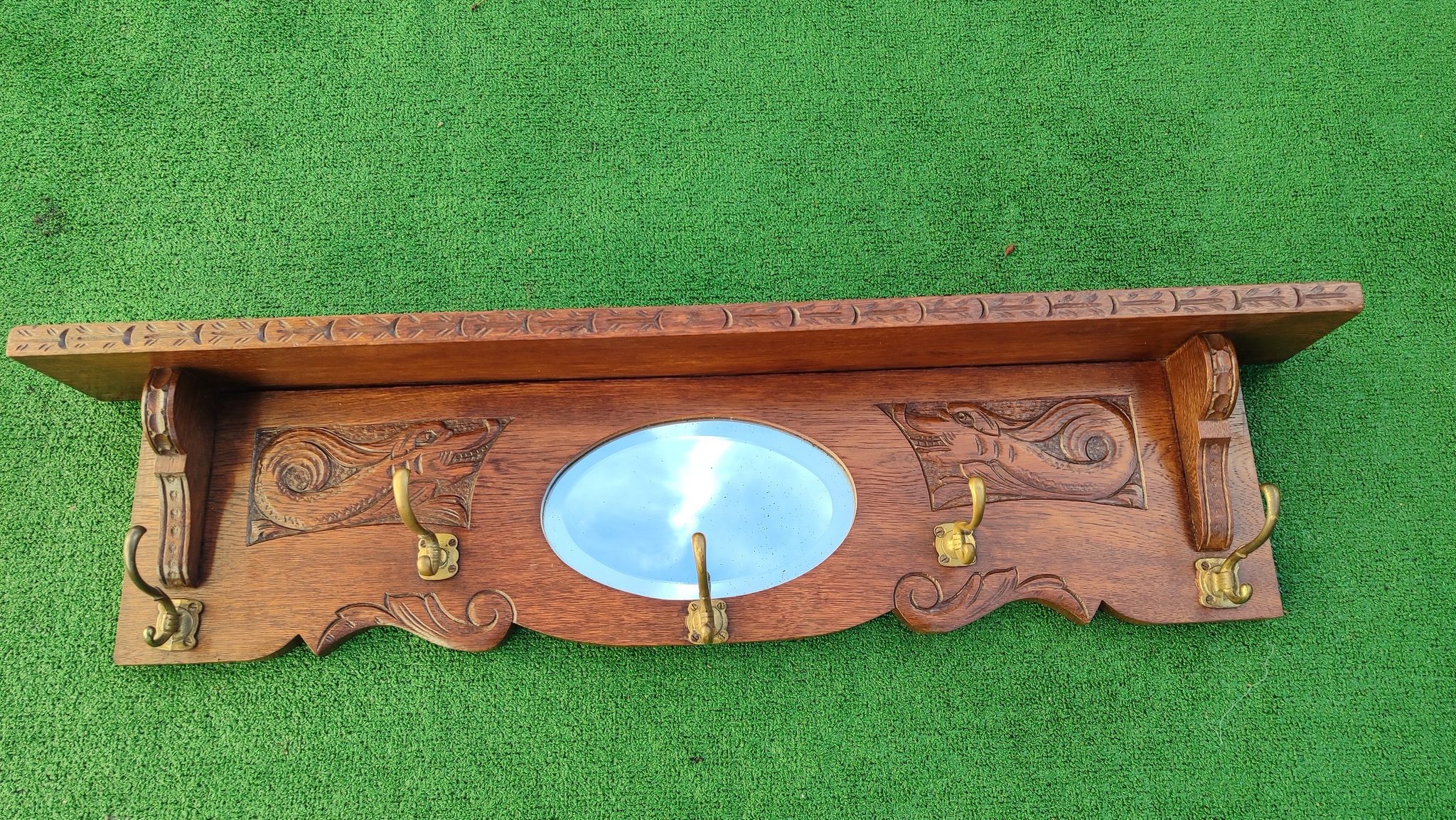Старинна дъбова закачалка с рафт отгоре, огледало и дърворезба (змейове)с красиви орнаменти!
