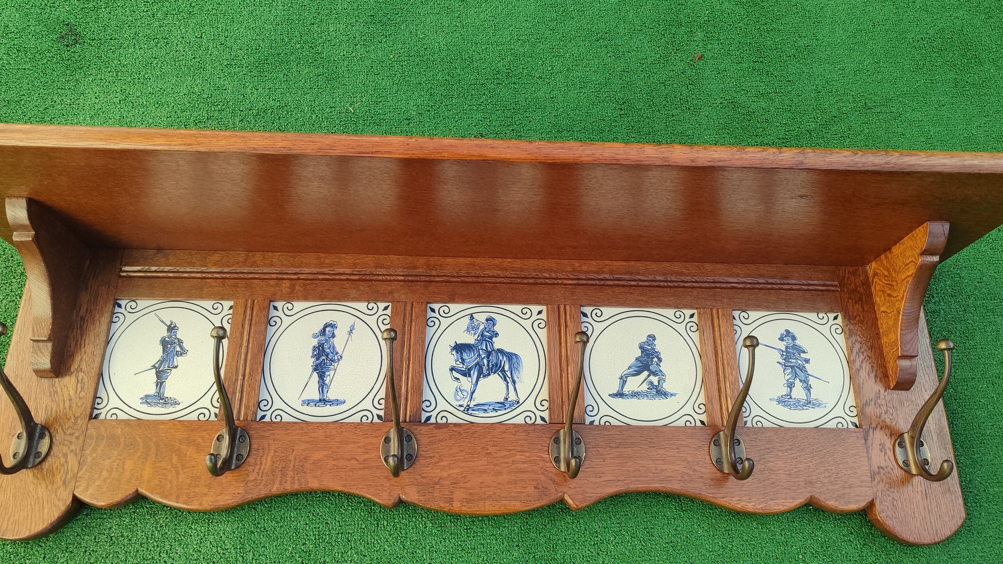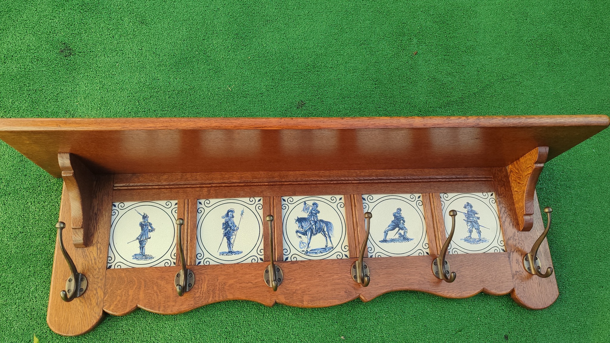 Масивна дъбова закачалка с рафт отгоре и порцеланови плочки с войници, дължина 110 см,6 бр окачвачи!