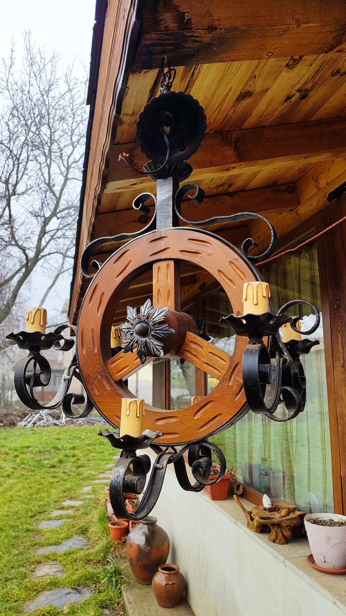 Красив масивен полилей съчетание от дървено колело и ковано желязо!