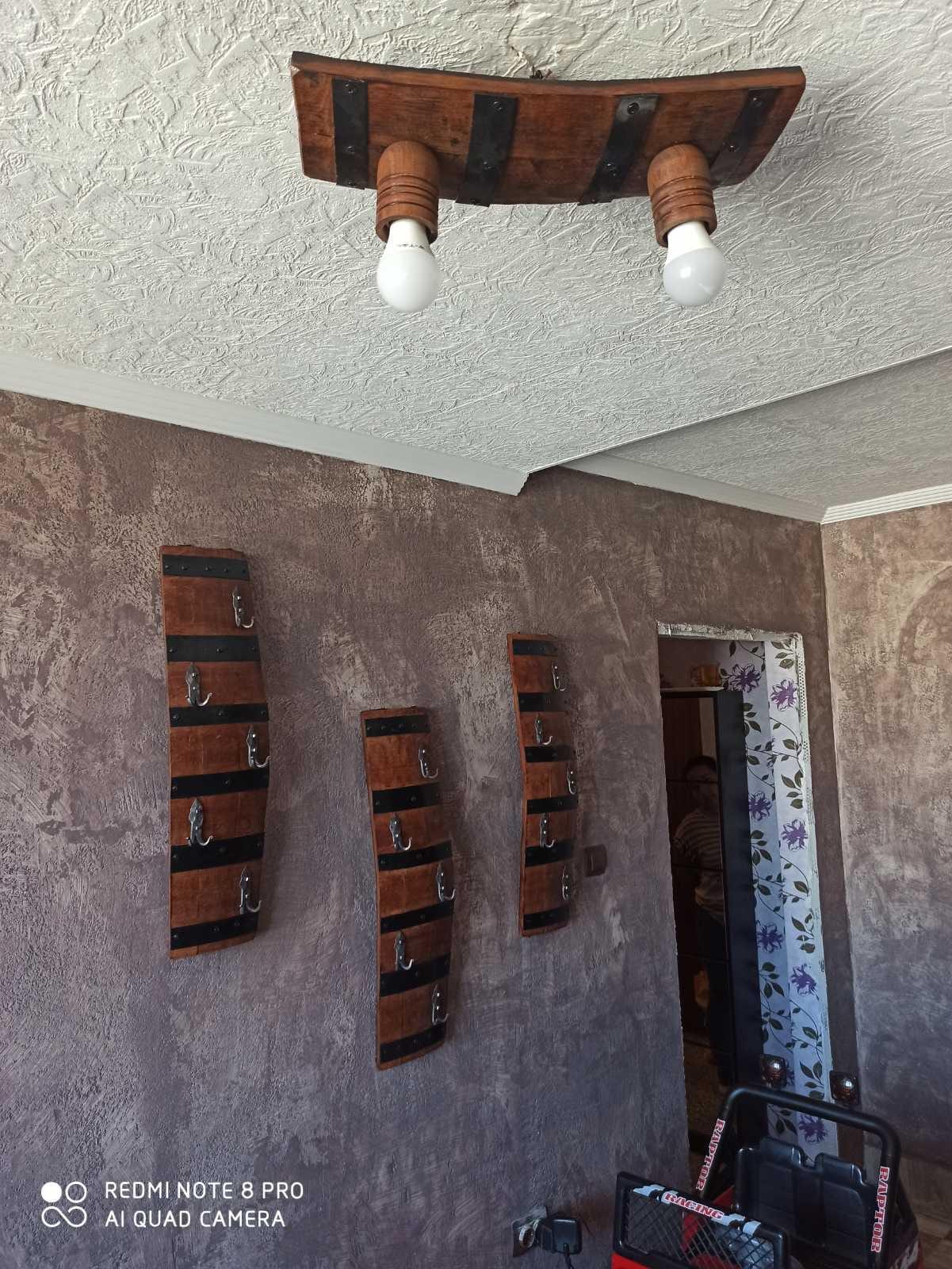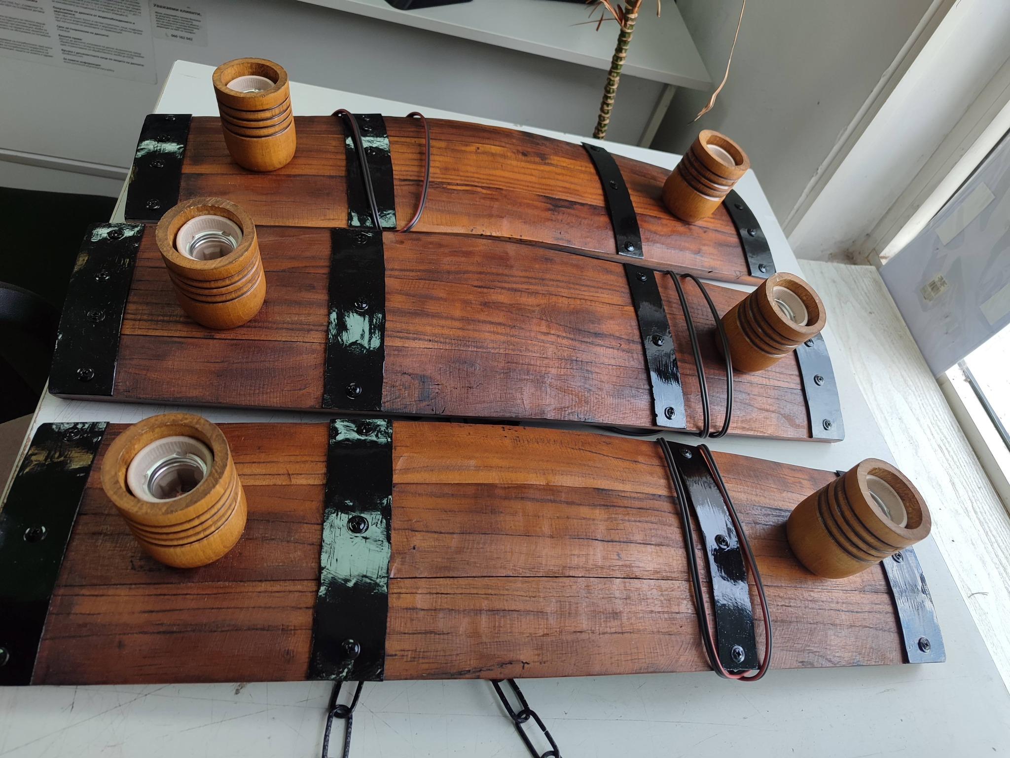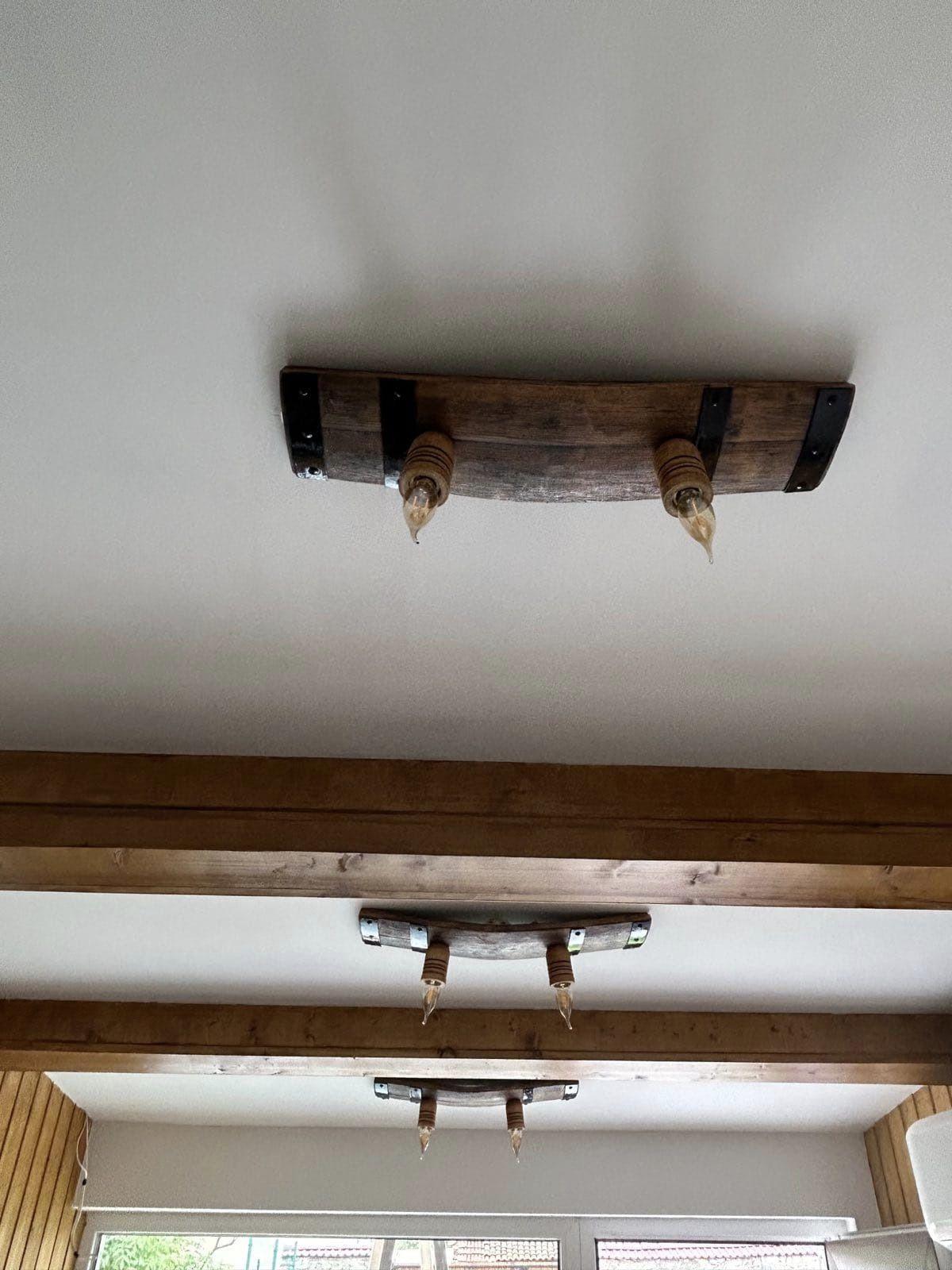Изработваме полилеи от атвтентични реставрирани бъчви с 2 ръчно изработени дървени чашки!Дължина между 50-60 см,цвета на лака е по желание на клиента-орех,кестен,дъб,палисандър,Фасунгите могат да бъдат Е 14 или Е 27,със синджири или за директен монтаж на тавана!