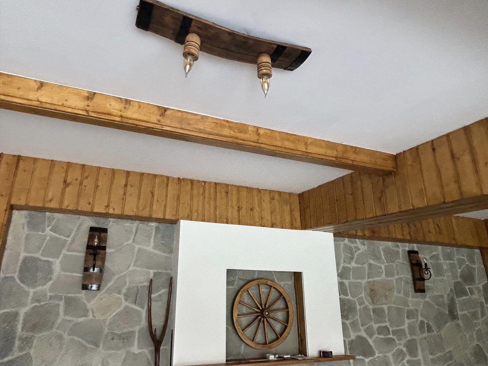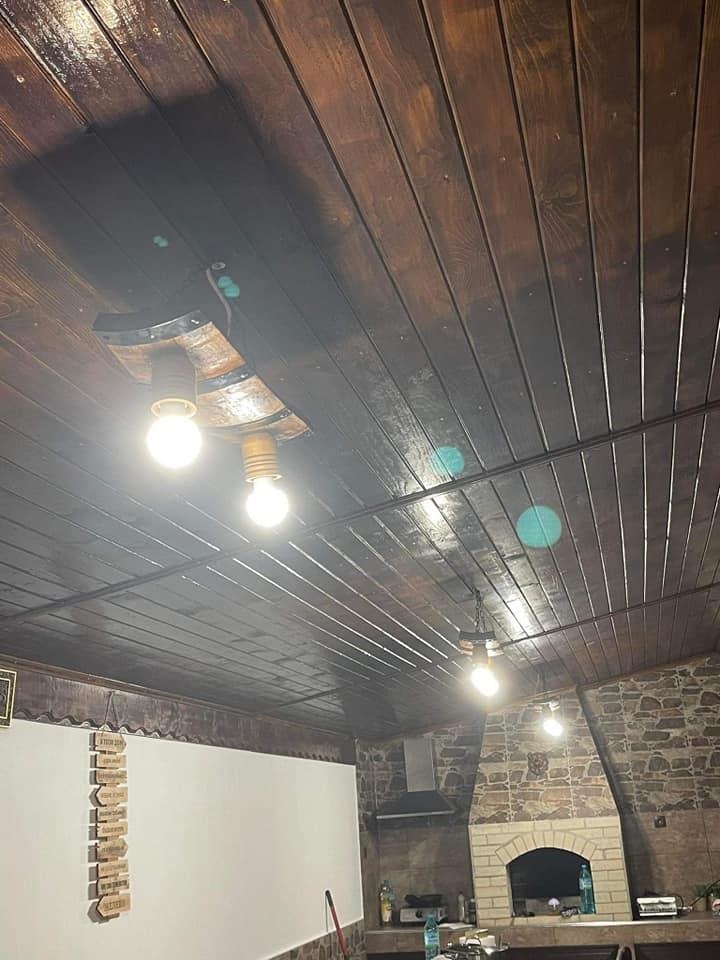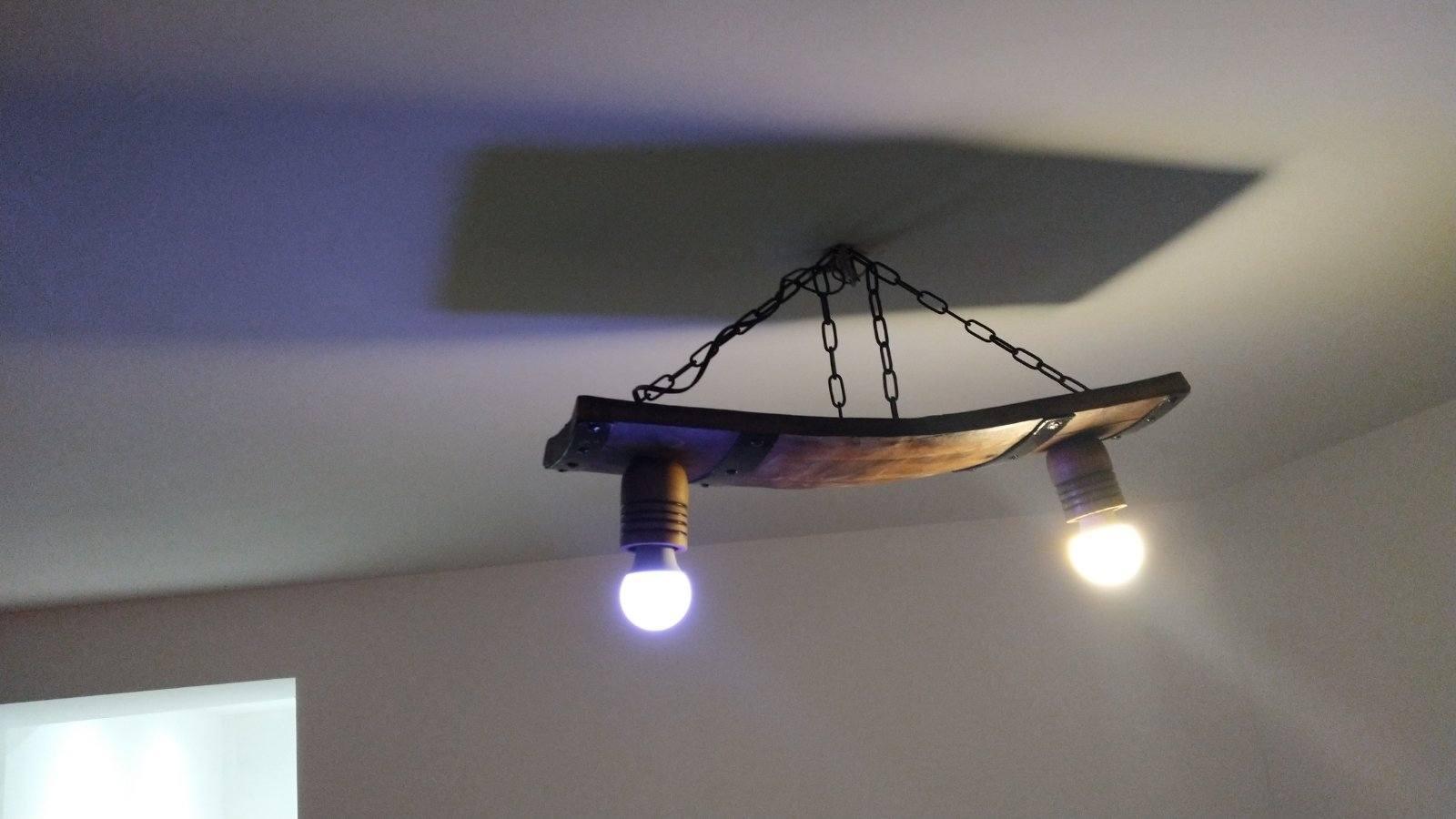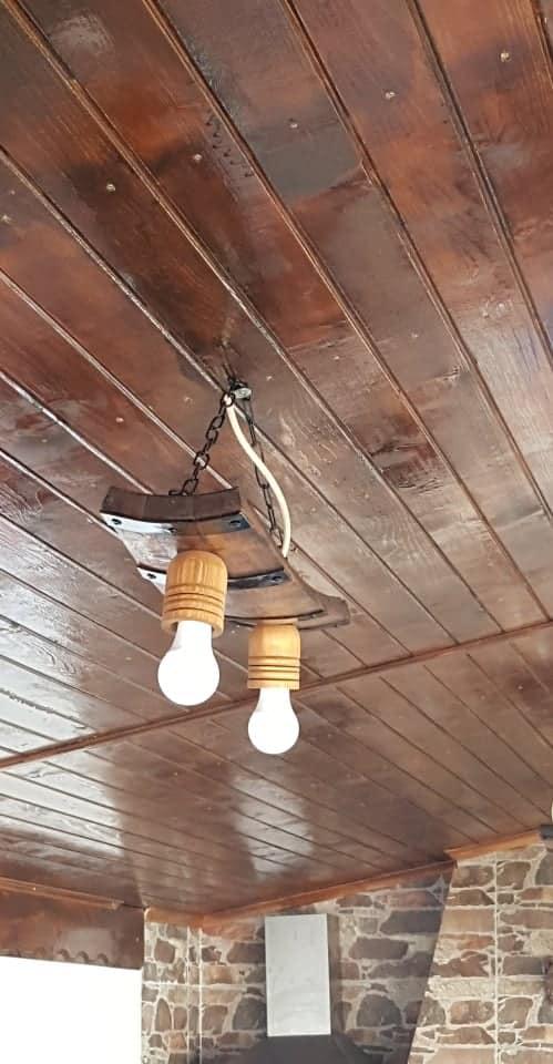 Изработваме полилеи от атвтентични реставрирани бъчви с 2 ръчно изработени дървени чашки!Дължина между 50-60 см,цвета на лака е по желание на клиента-орех,кестен,дъб,палисандър,Фасунгите могат да бъдат Е 14 или Е 27,със синджири или за директен монтаж на тавана!