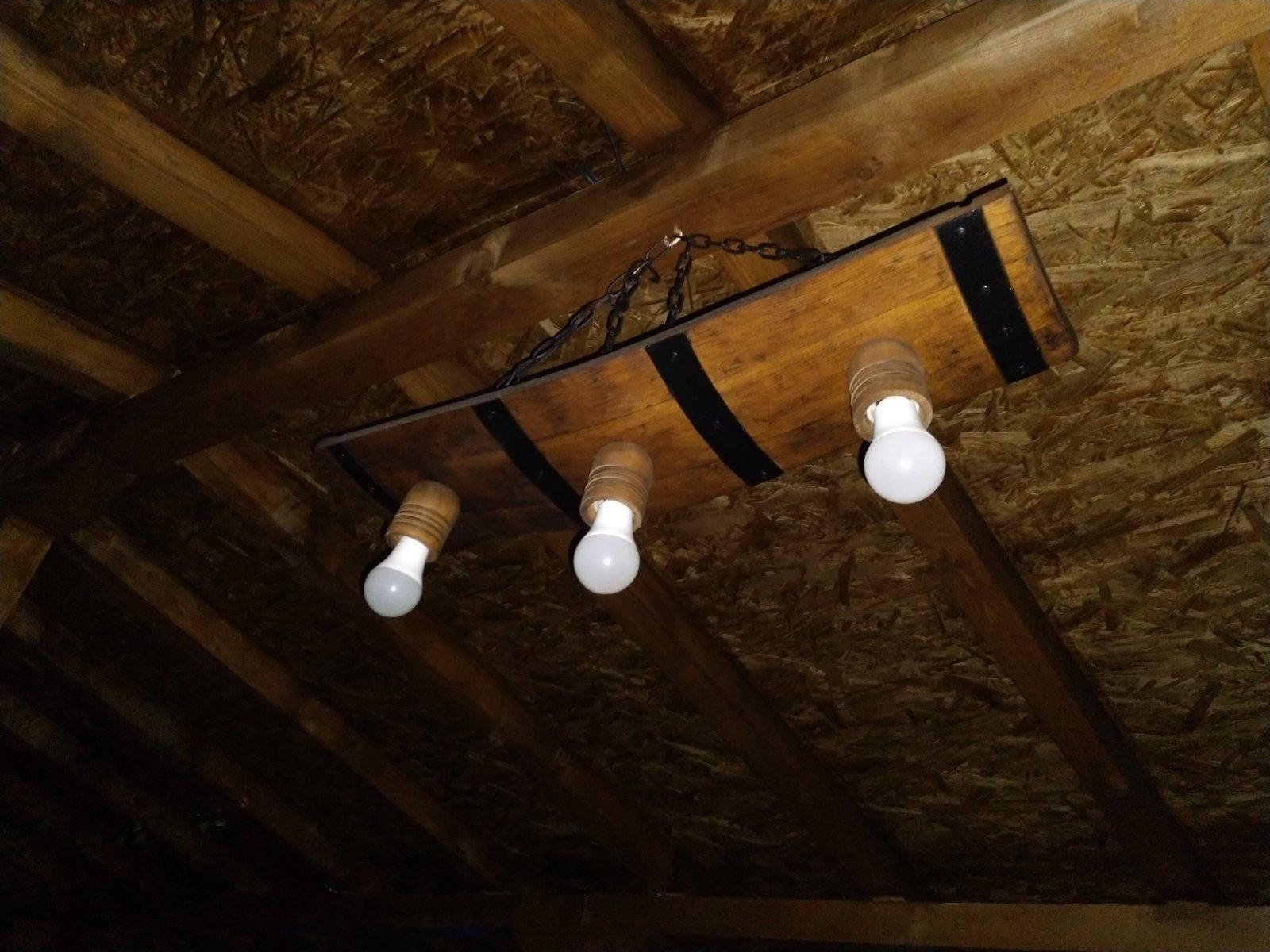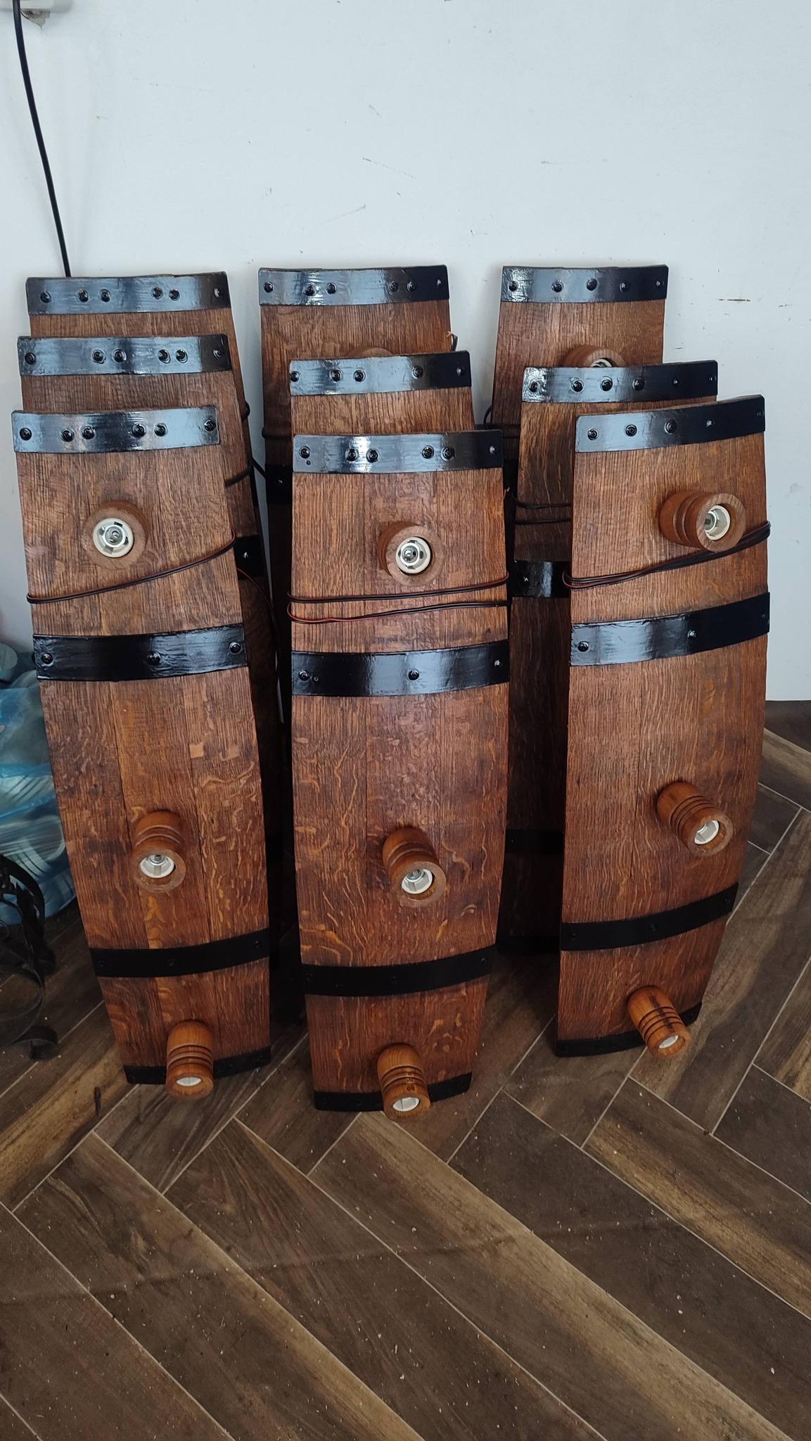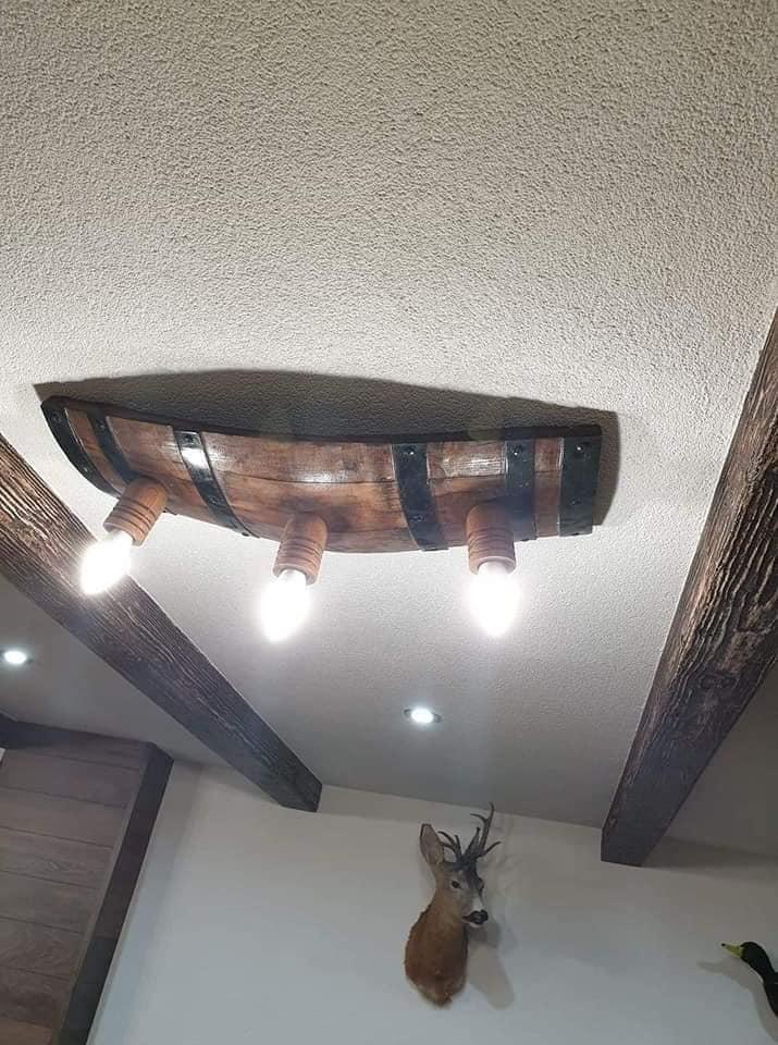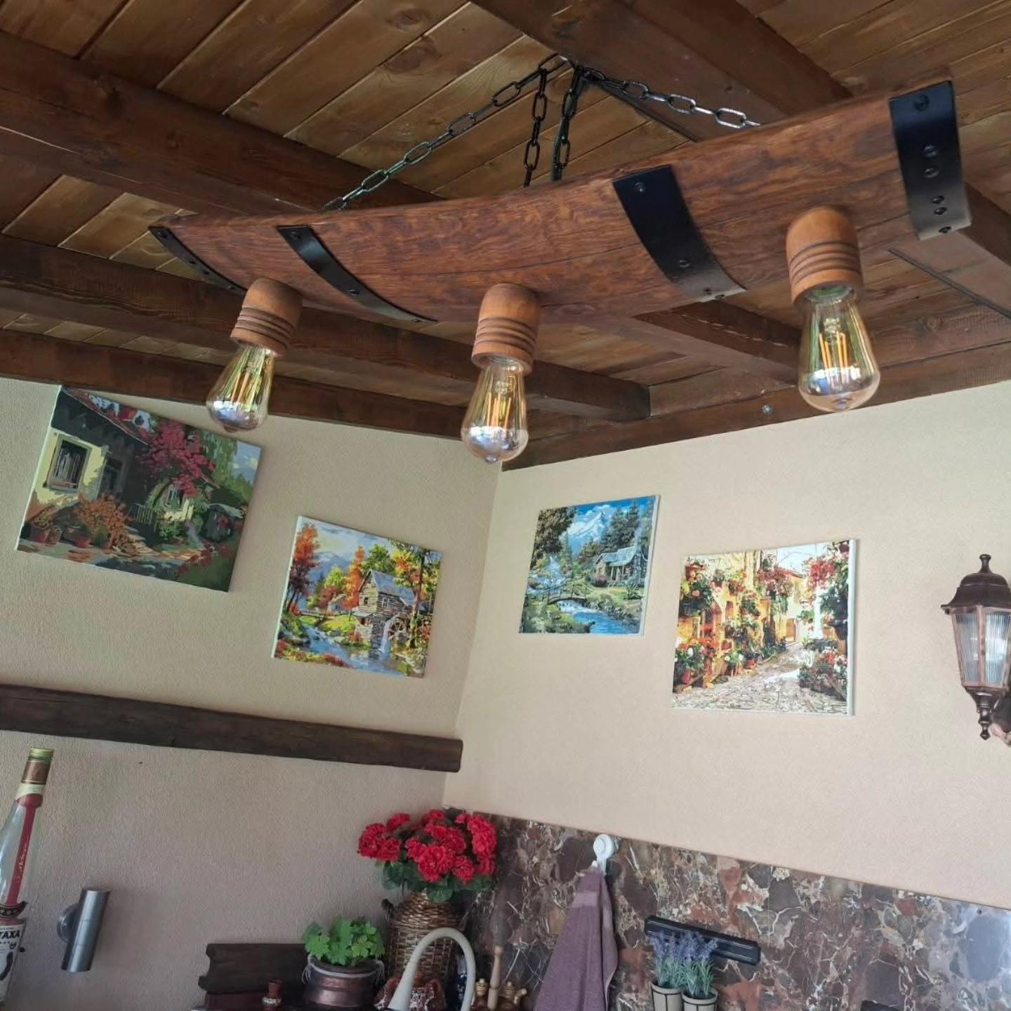 Eтно полилеи от автентични реставрирани бъчви с 3 ръчно изработени дървени чашки за фасунгите. Дължина 70-80 см, ширина 20-25 см.Фасунгите могат да бъдат Е 14 или Е 27 ,със синджири или за директен монтаж на тавана! Възможна изработка по размери на клиента. Подходящи за вашите механи, битови кътчета, ресторанти, барбекюта, навеси, подаръци и др.