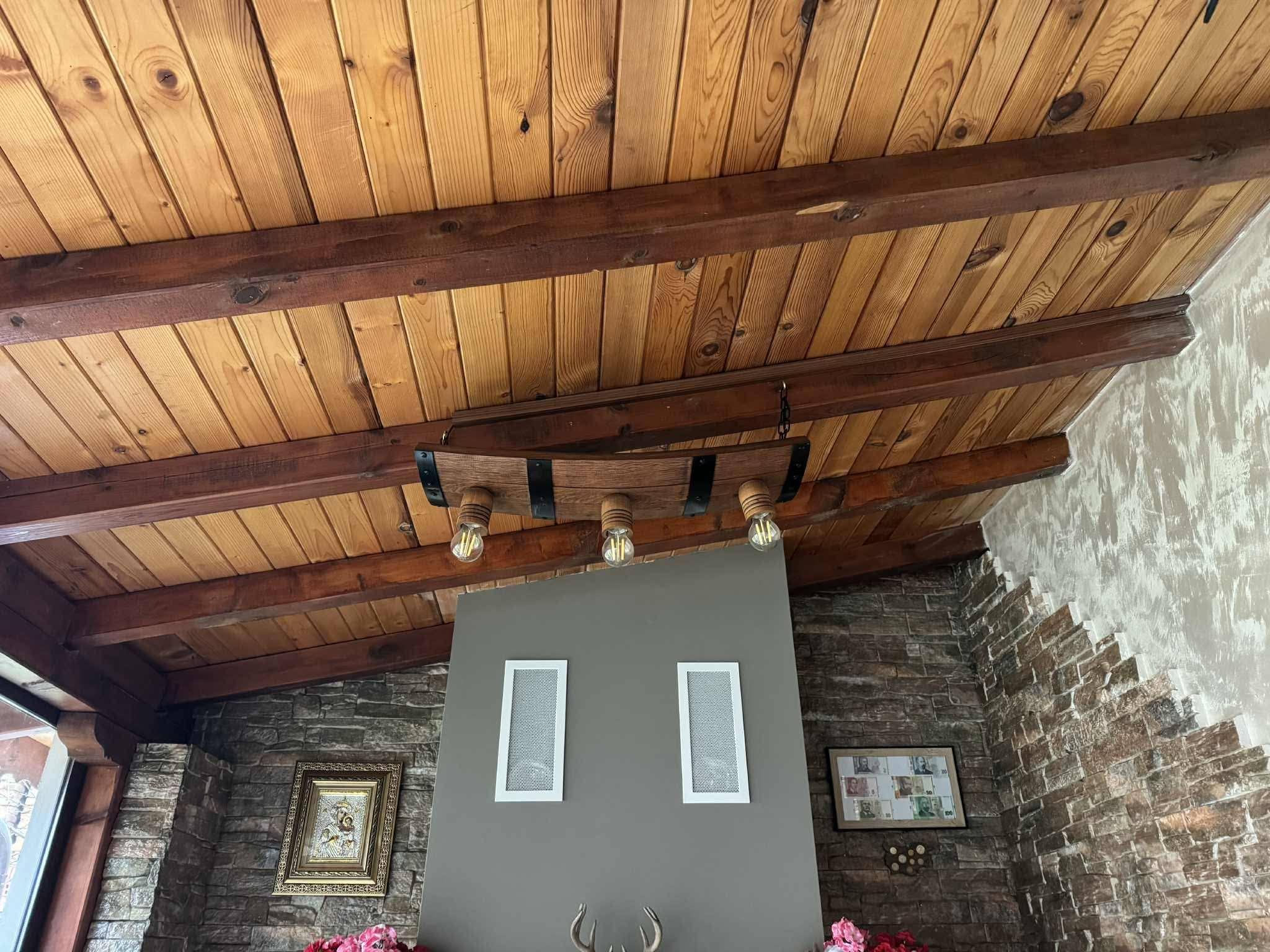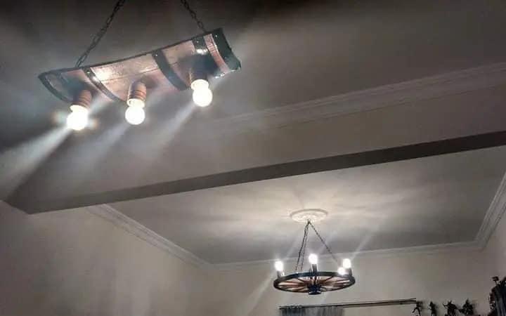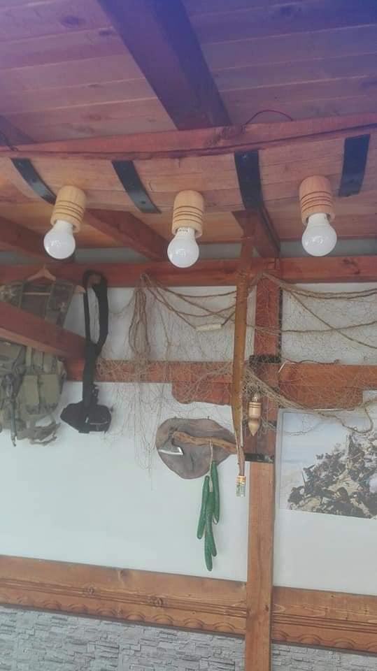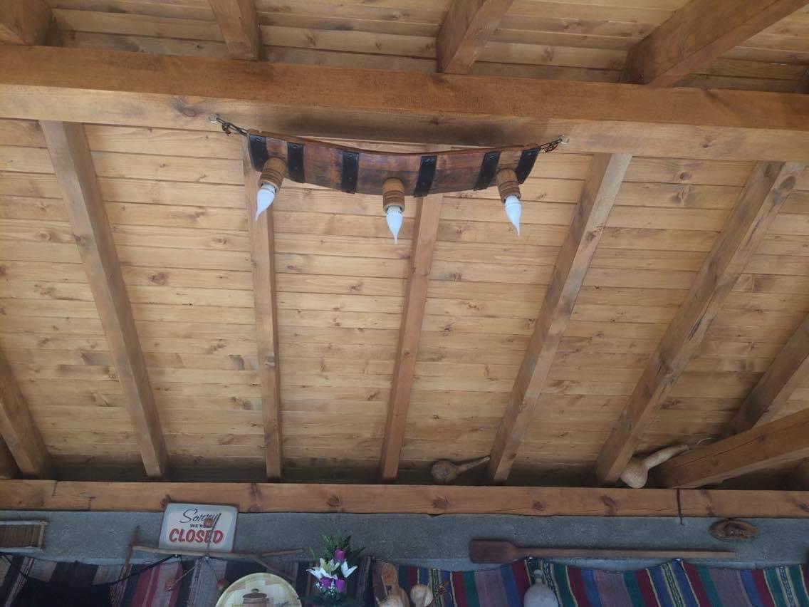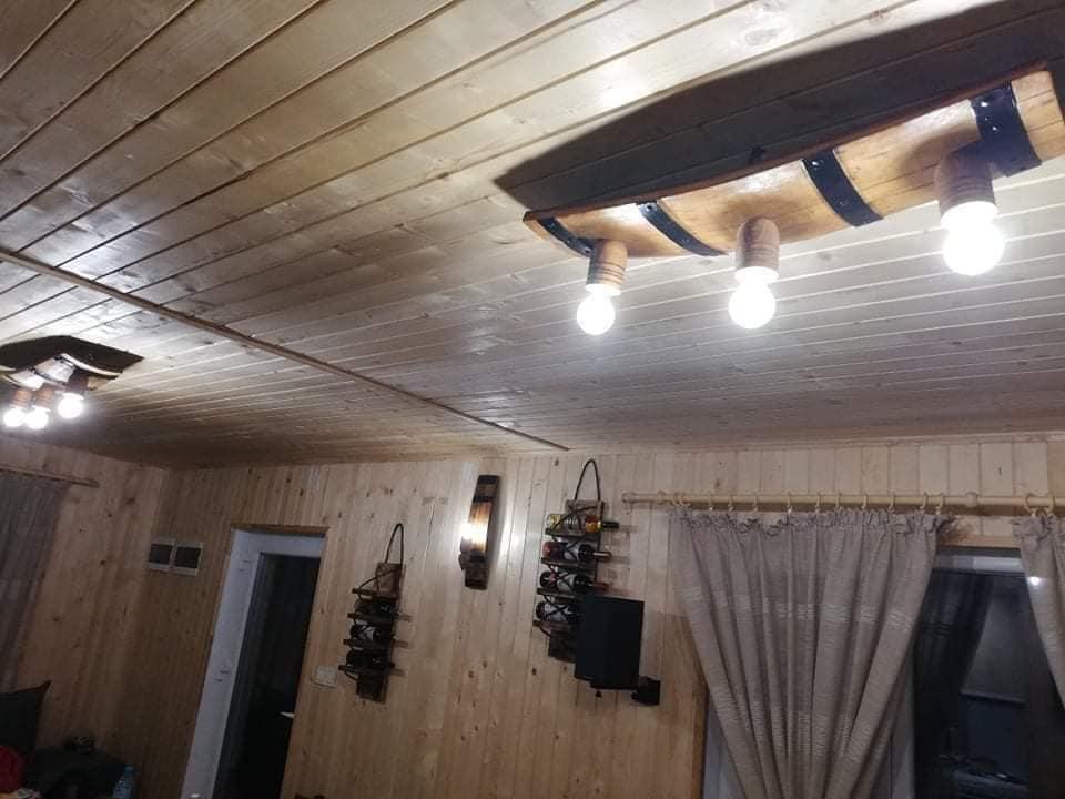 Eтно полилеи от автентични реставрирани бъчви с 3 ръчно изработени дървени чашки за фасунгите. Дължина 70-80 см, ширина 20-25 см.Фасунгите могат да бъдат Е 14 или Е 27 ,със синджири или за директен монтаж на тавана! Възможна изработка по размери на клиента. Подходящи за вашите механи, битови кътчета, ресторанти, барбекюта, навеси, подаръци и др.