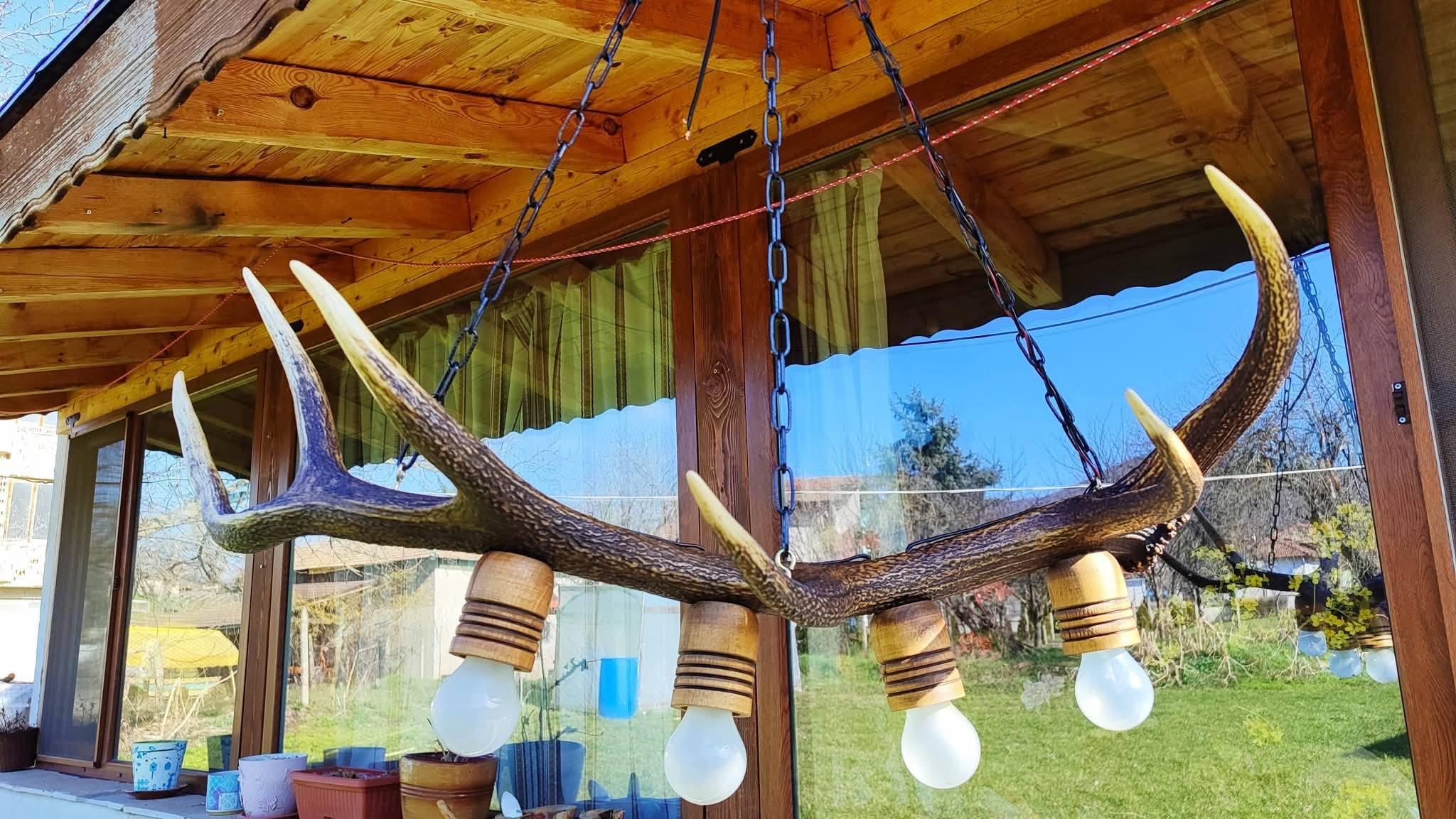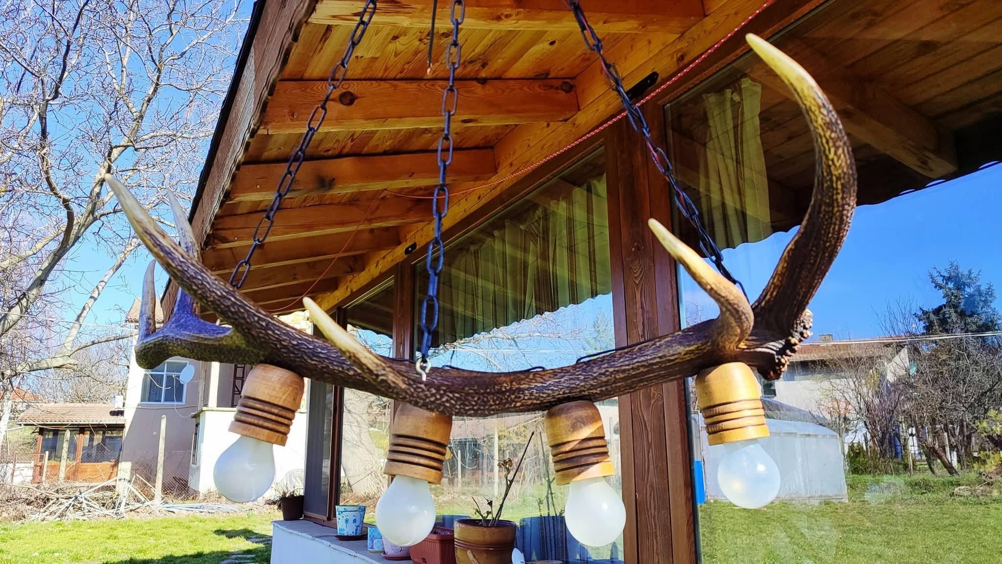 Ръчно изработен полилей с еленов рог с дървени чашки,фасунги Е 27,със синджири,дължина около метър