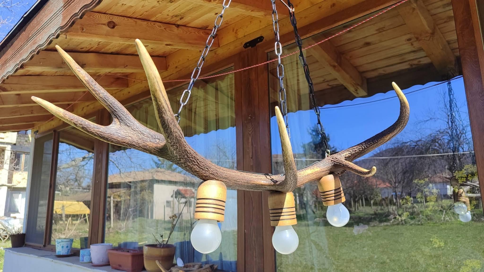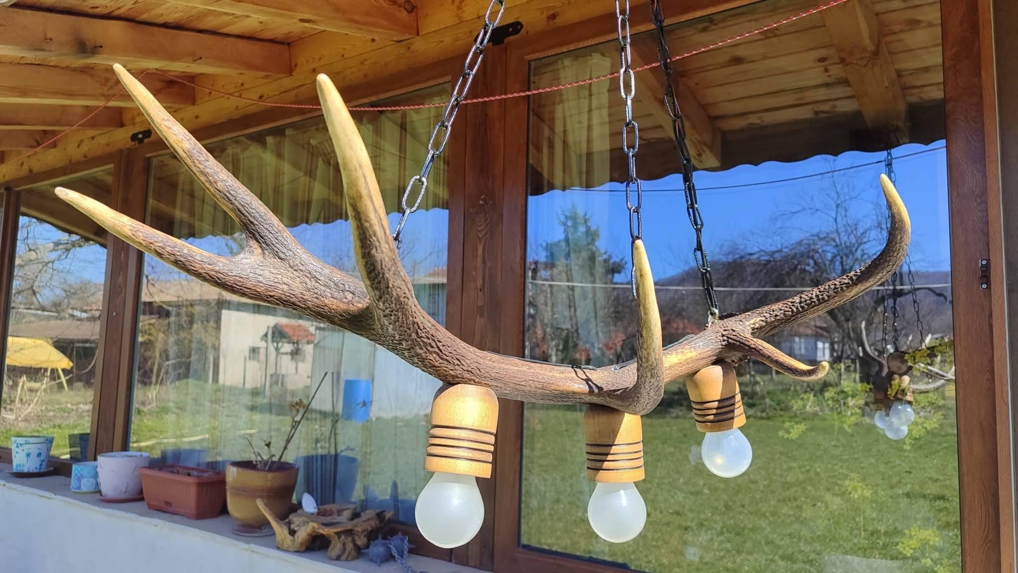 Ръчно изработен полилей от рога на елен с ръчно изработени дървени чашки, Фасунгите са Е 27 стандартни, със синджири, дължина около 80 см