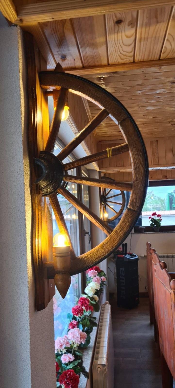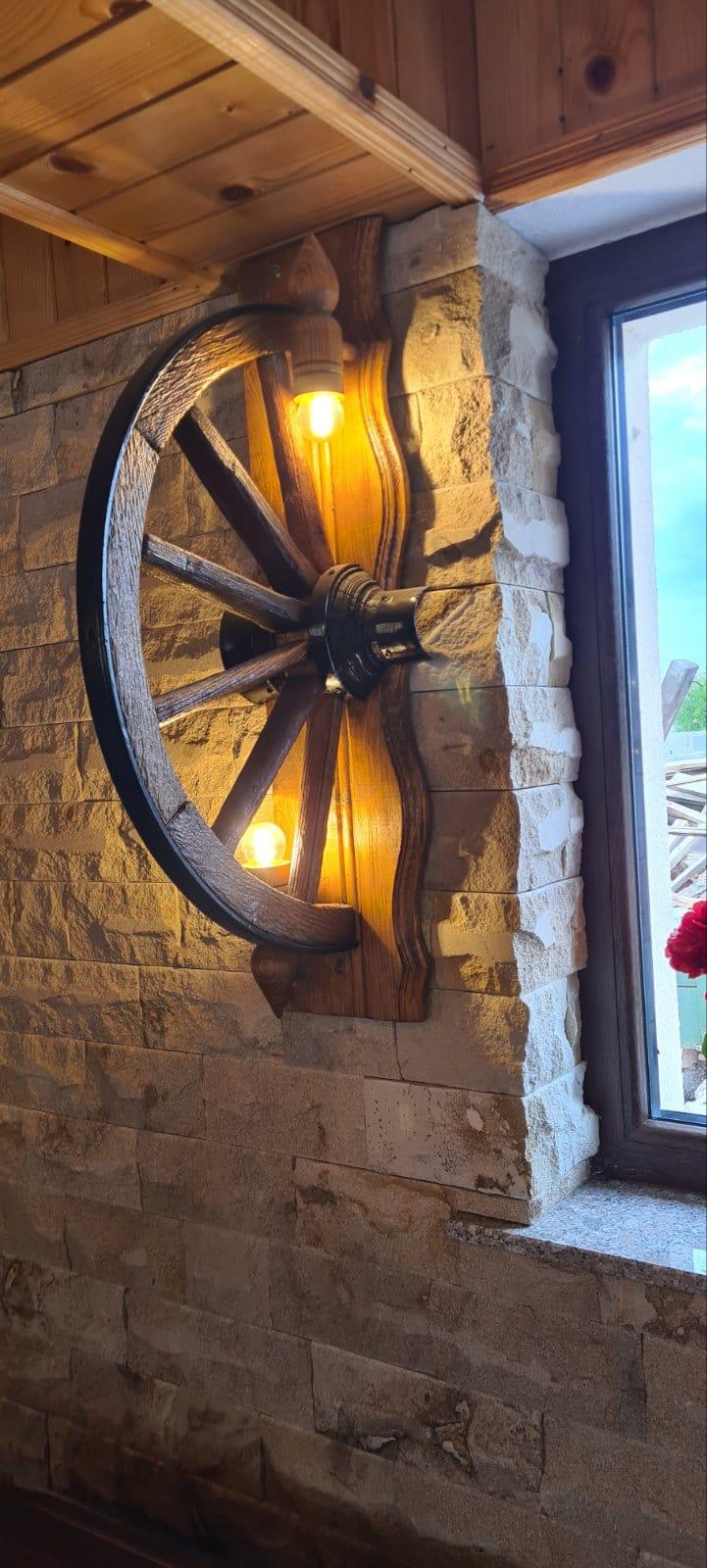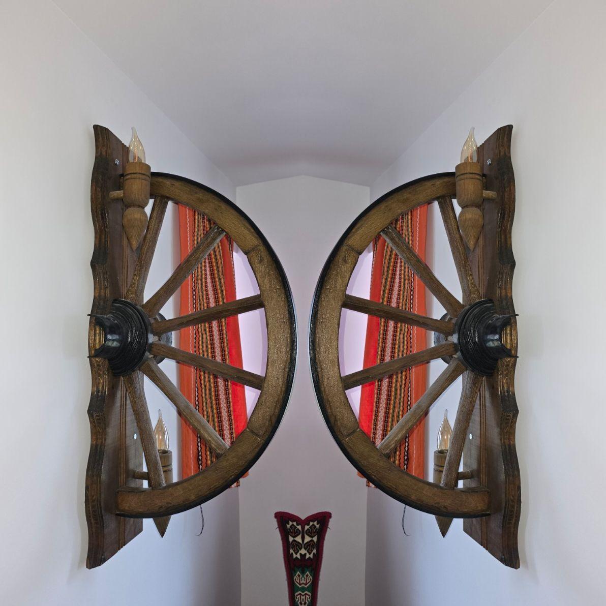 Автентични етнографски стенни лампи от реставрирани колела от каруца с 2 ръчно изработени дървени чашки-конус, подходящи за механи барбекюта, беседки, навеси, барове и подаръци. Фасунгите са Е14 и техният брой е 2. Цвета на лака може да бъде- кестен , орех,дъб,палисандър,яхтен . Цвета на боята за металните части черен. Диаметъра на колелата от 63см-70см!