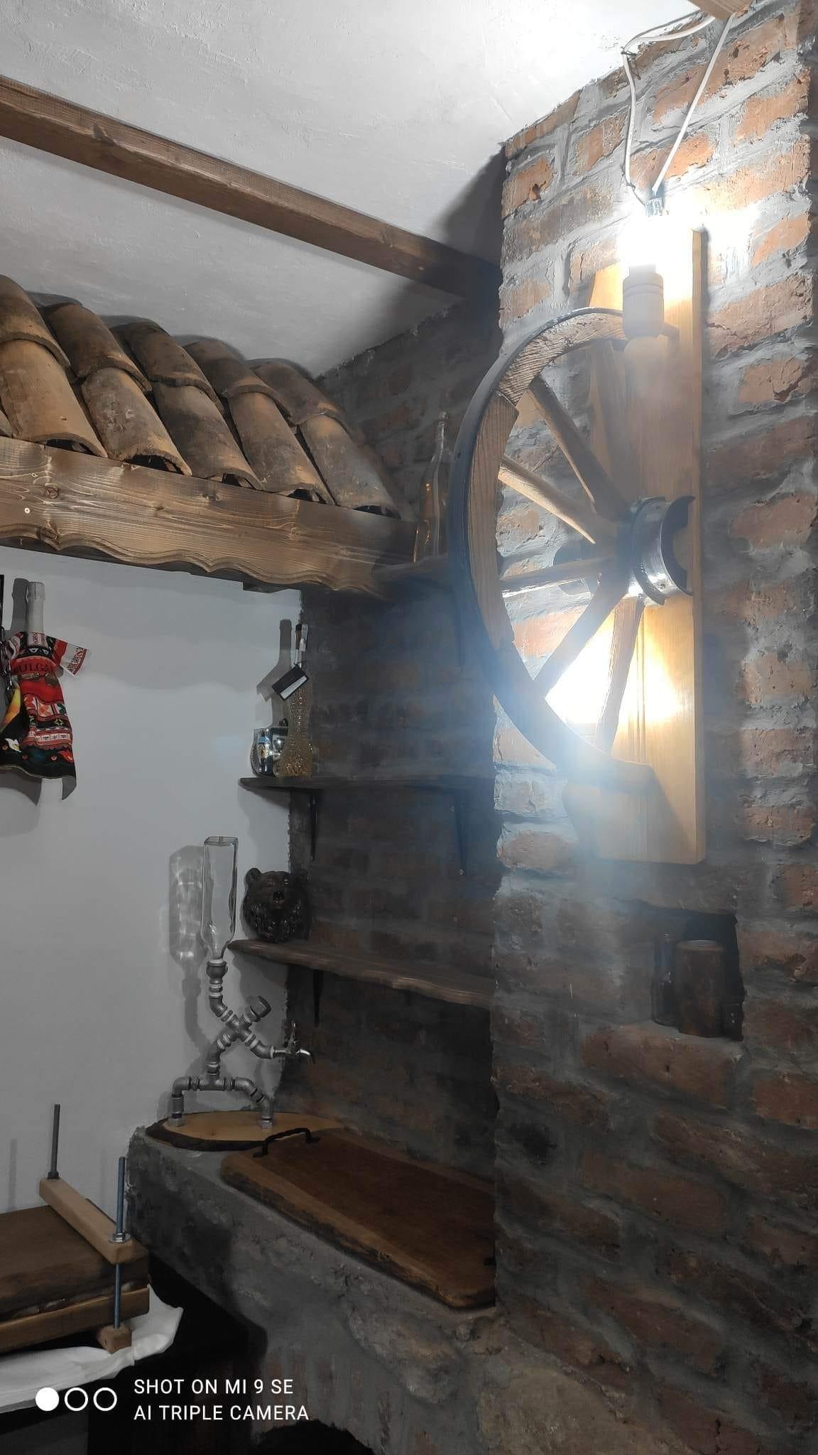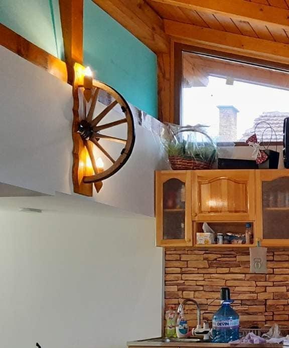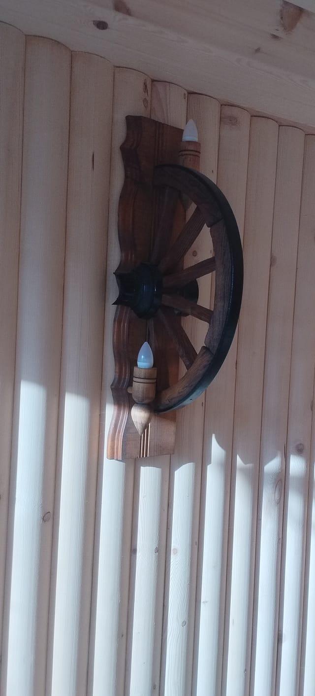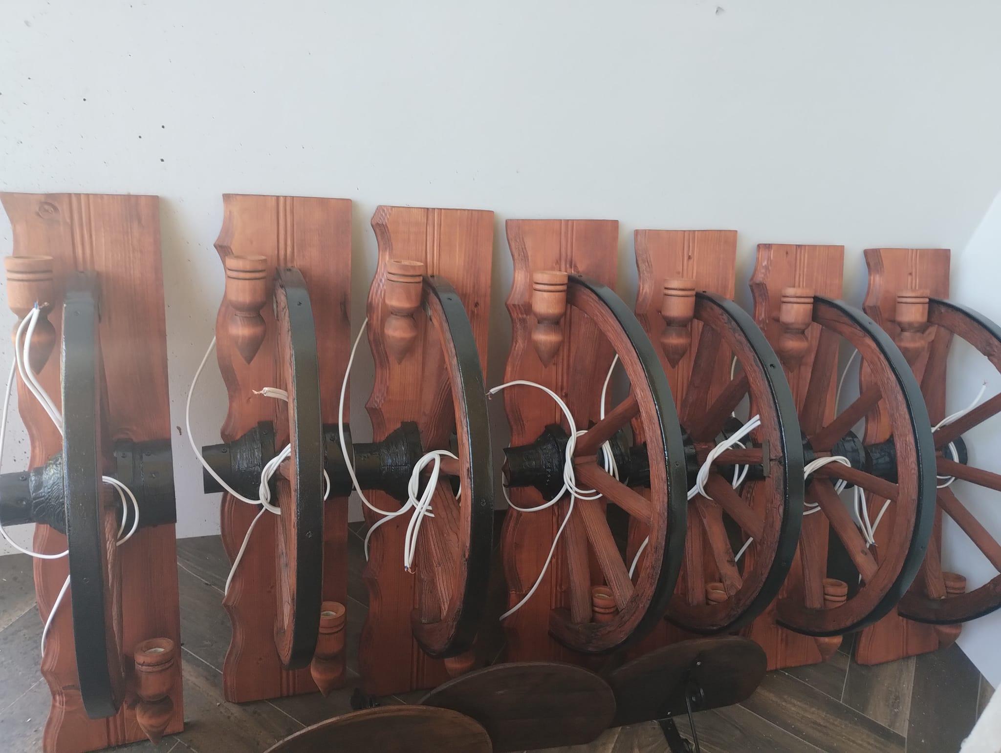 Автентични етнографски стенни лампи от реставрирани колела от каруца с 2 ръчно изработени дървени чашки-конус, подходящи за механи барбекюта, беседки, навеси, барове и подаръци. Фасунгите са Е14 и техният брой е 2. Цвета на лака може да бъде- кестен , орех,дъб,палисандър,яхтен . Цвета на боята за металните части черен. Диаметъра на колелата от 63см-70см!
