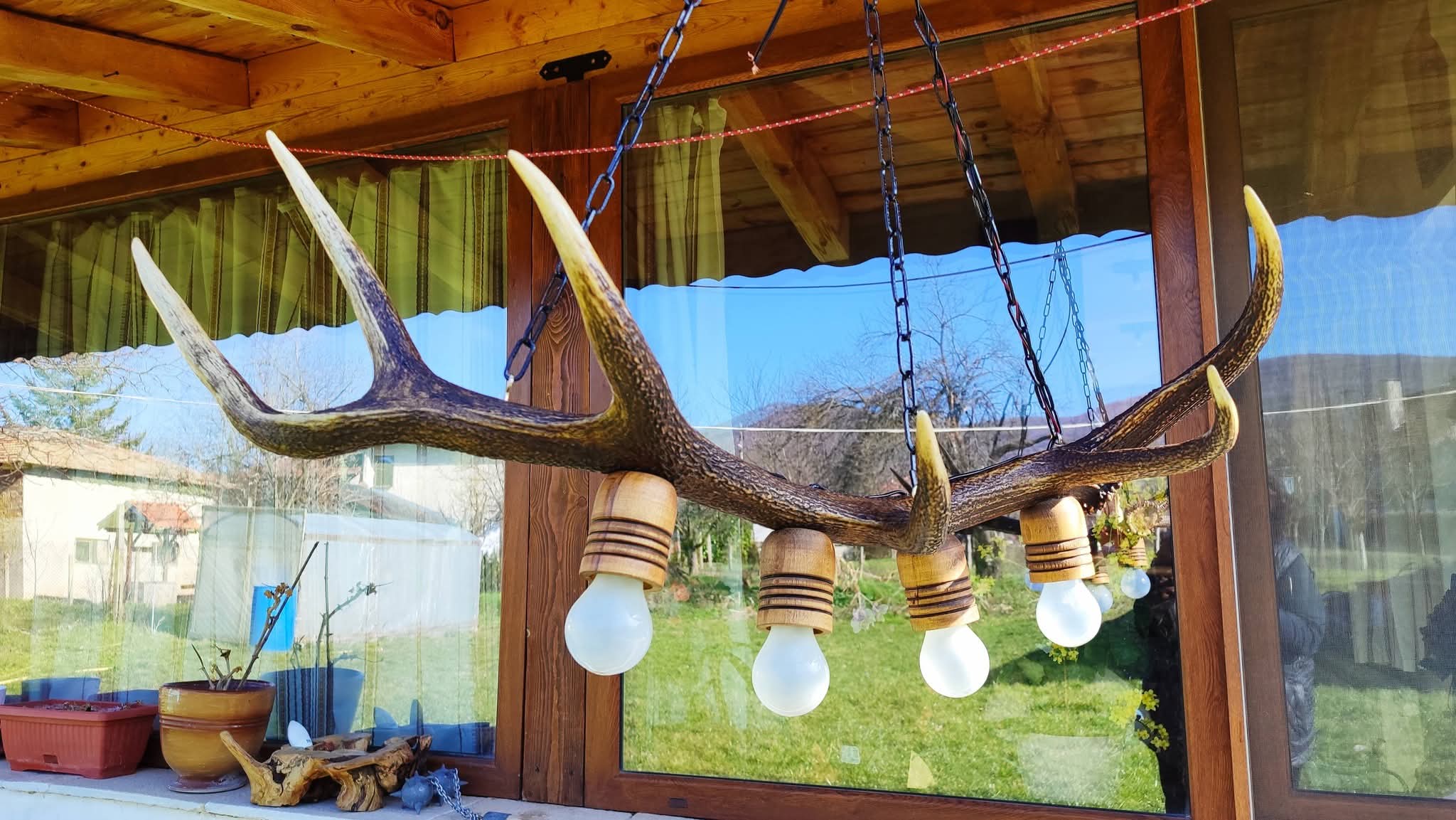 Красива масивна дъбова закачалка с рафт отгоре, порцеланови плочки със селски мотиви и месингови двойни окачвачи с 🦁 лъвове!