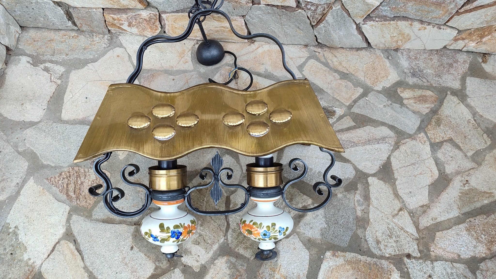 Уникален масивен дъбов полилей с красиви орнаменти и платнени абажури с нашивки!