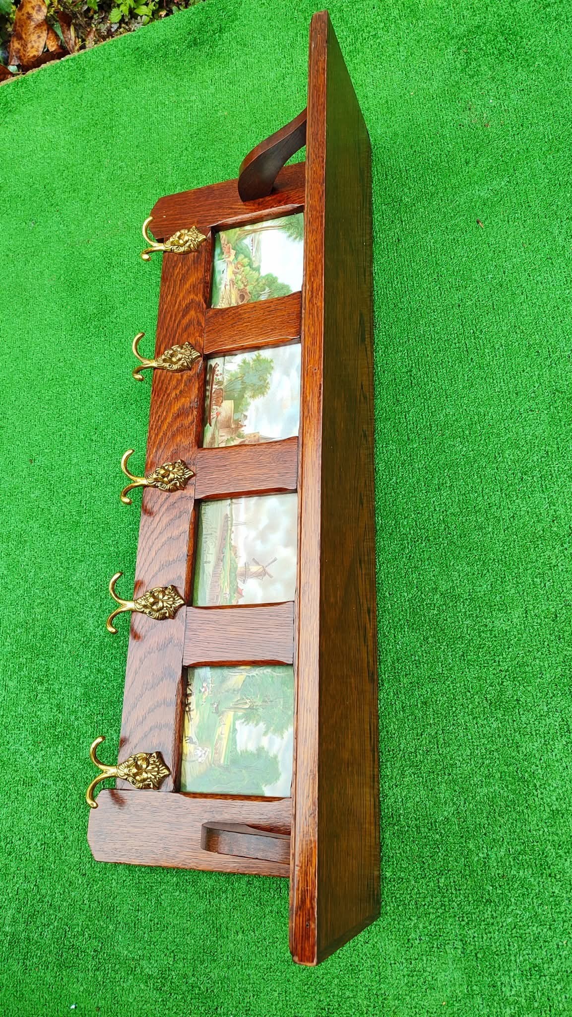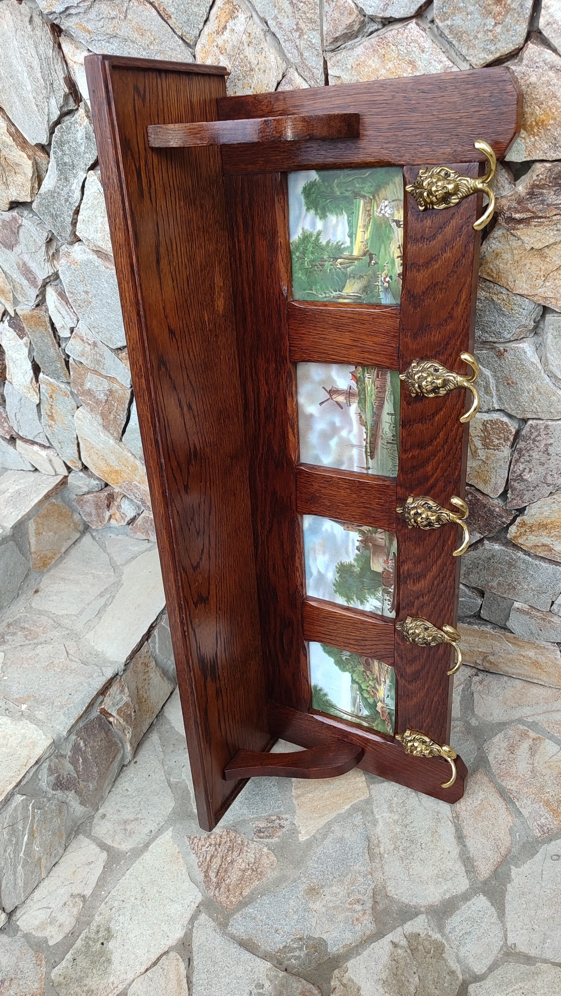 Красива масивна дъбова закачалка с рафт отгоре, порцеланови плочки със селски мотиви и месингови двойни окачвачи с 🦁 лъвове!