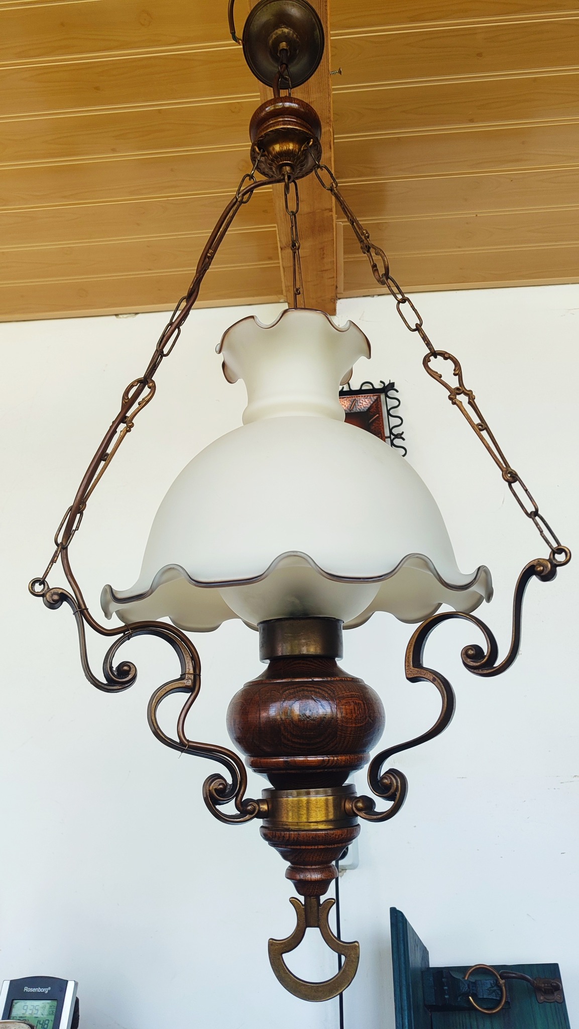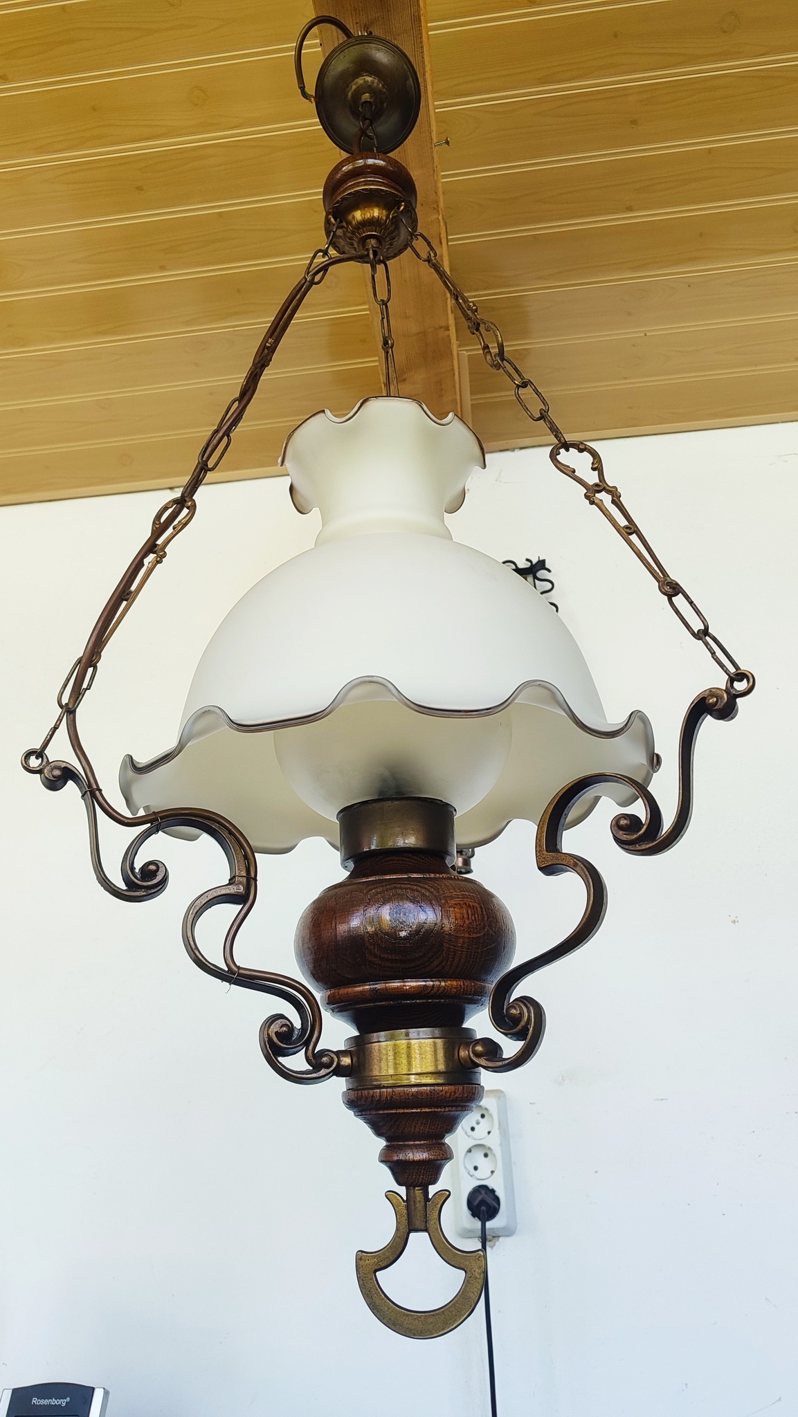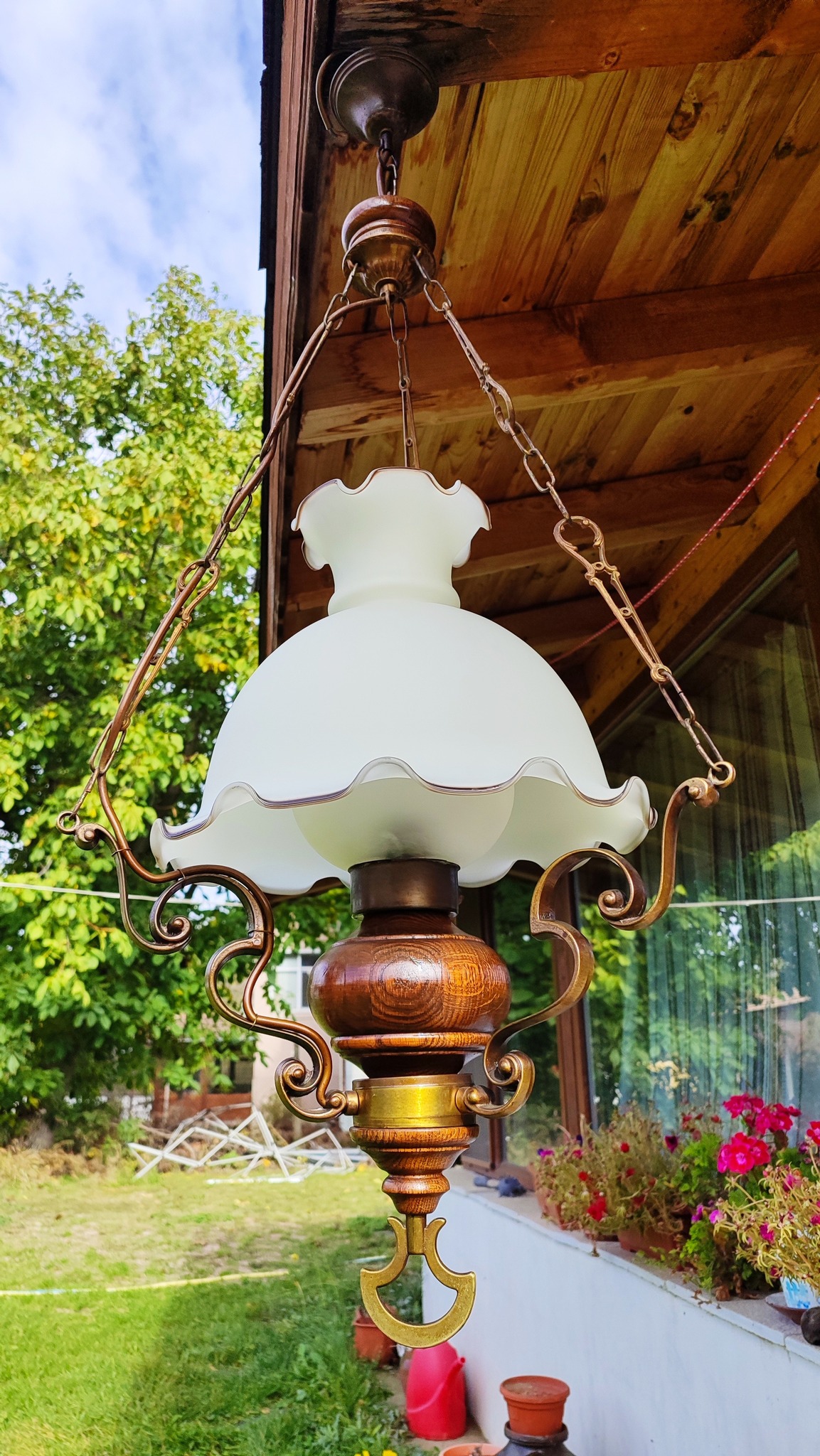 Красив масивен месингов полилей съчетание с дървени елементи, красиви орнаменти,две стъкленици, фасунга Е 27 стандартна, със синджири и розетка, височина до розетка около метър!Красив и стилен дизайн!