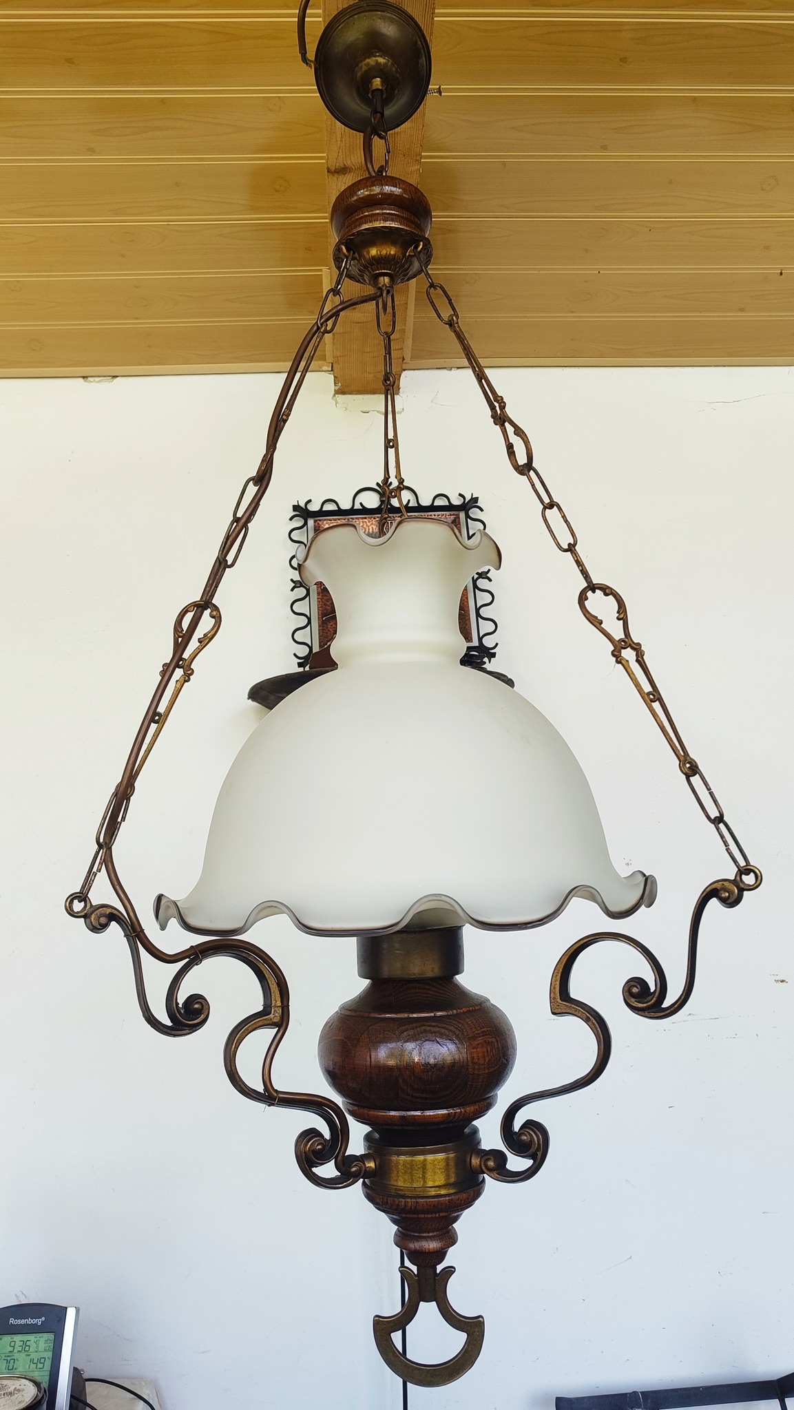 Красив масивен месингов полилей съчетание с дървени елементи, красиви орнаменти,две стъкленици!