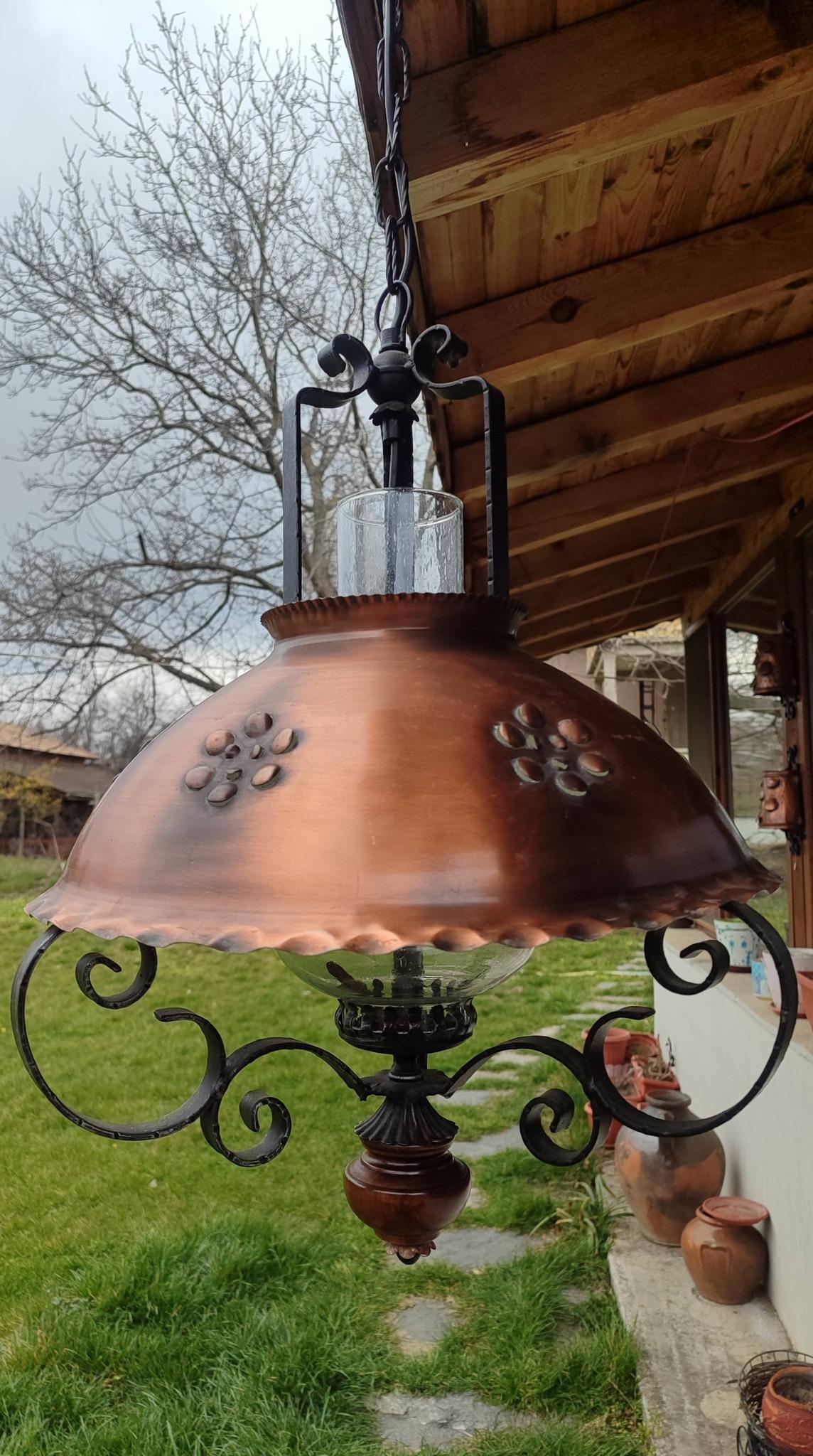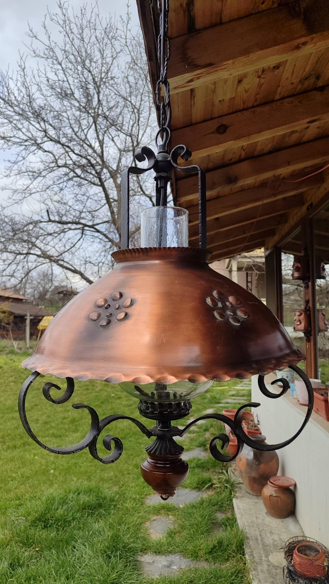 красив старинен полилей съчетание от дърво, ковано желязо и голям метален капак в меден цвят с орнаменти, фасунга Е 27 стандартна