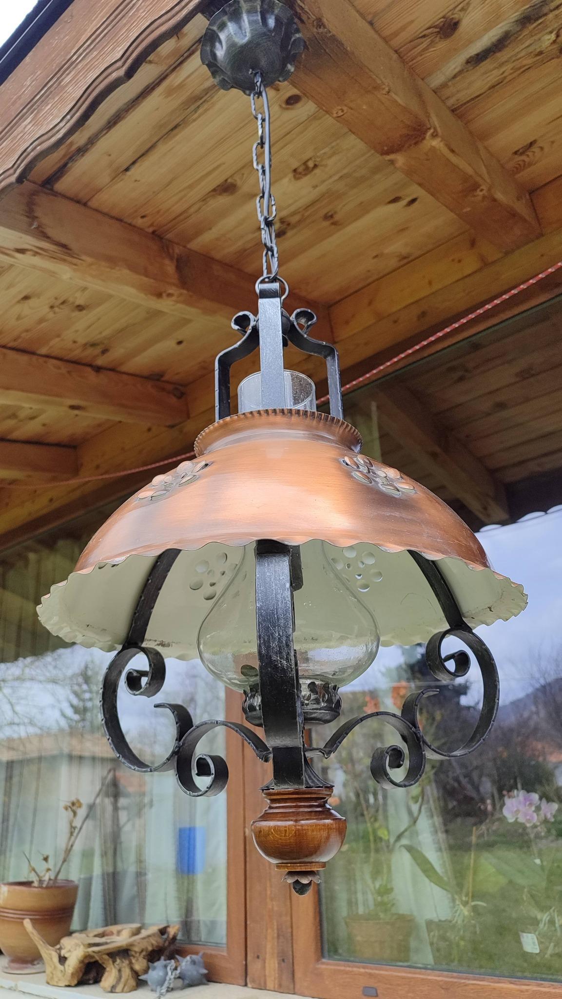 Голям старинен полилей съчетание от дърво, ковано желязо и метален капак с орнаменти!