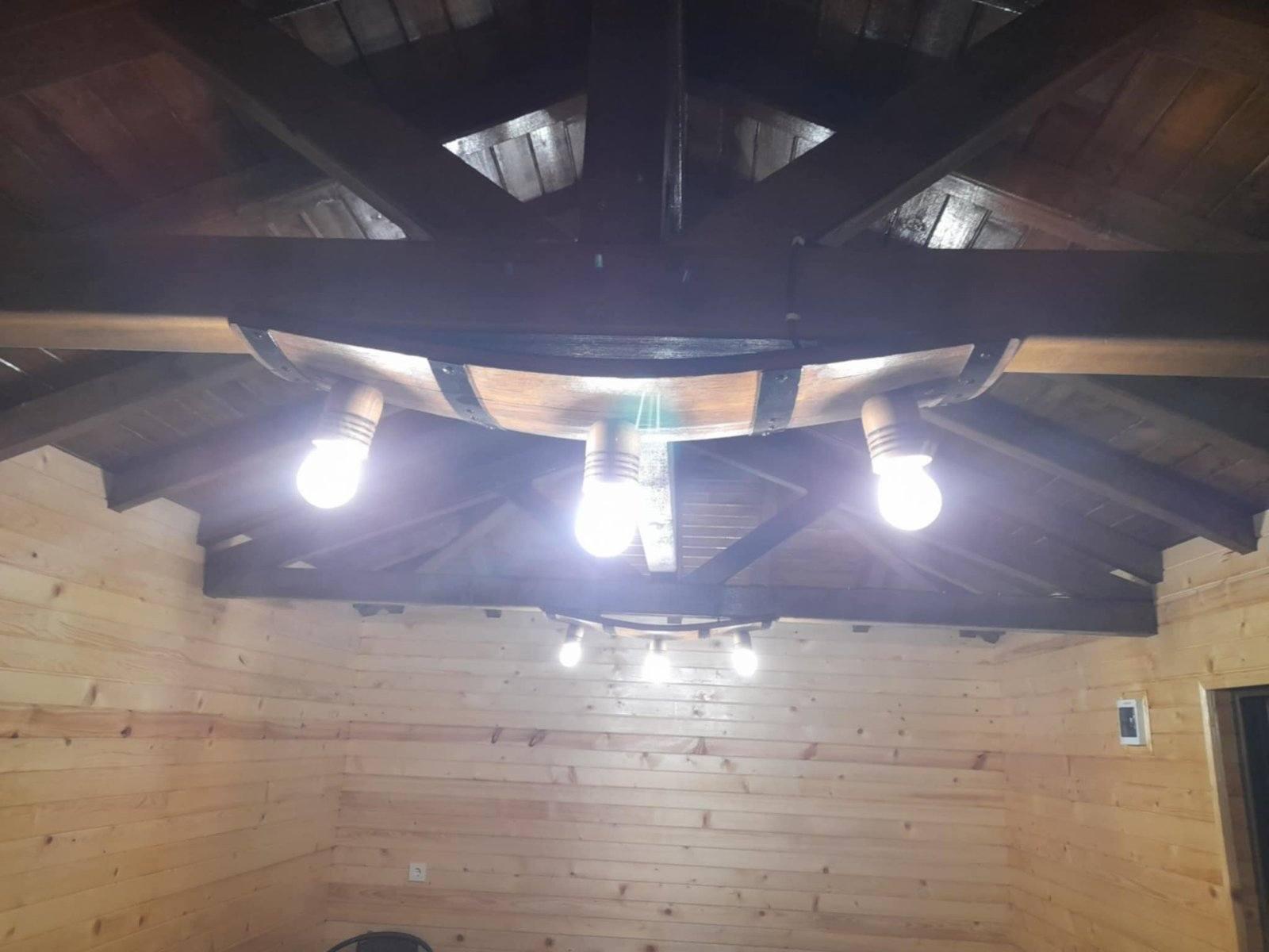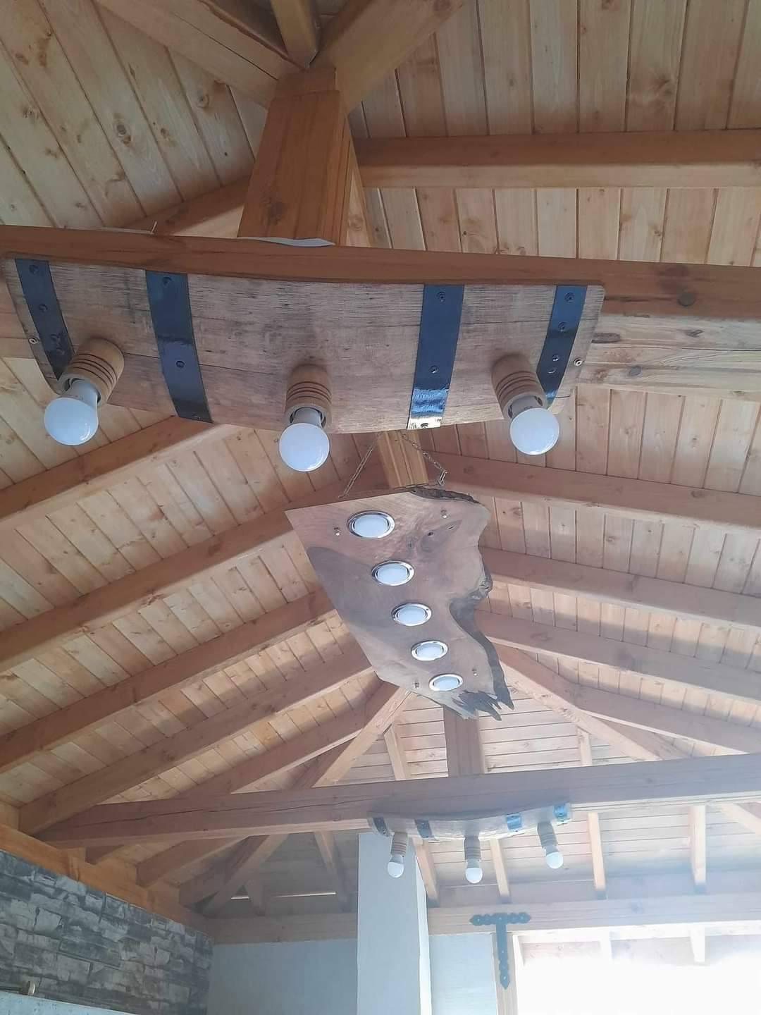 Eтно полилеи от автентични реставрирани бъчви с 3 ръчно изработени дървени чашки за фасунгите. Дължина 70-80 см, ширина 20-25 см.Фасунгите могат да бъдат Е 14 или Е 27 ,със синджири или за директен монтаж на тавана! Възможна изработка по размери на клиента. Подходящи за вашите механи, битови кътчета, ресторанти, барбекюта, навеси, подаръци и др.