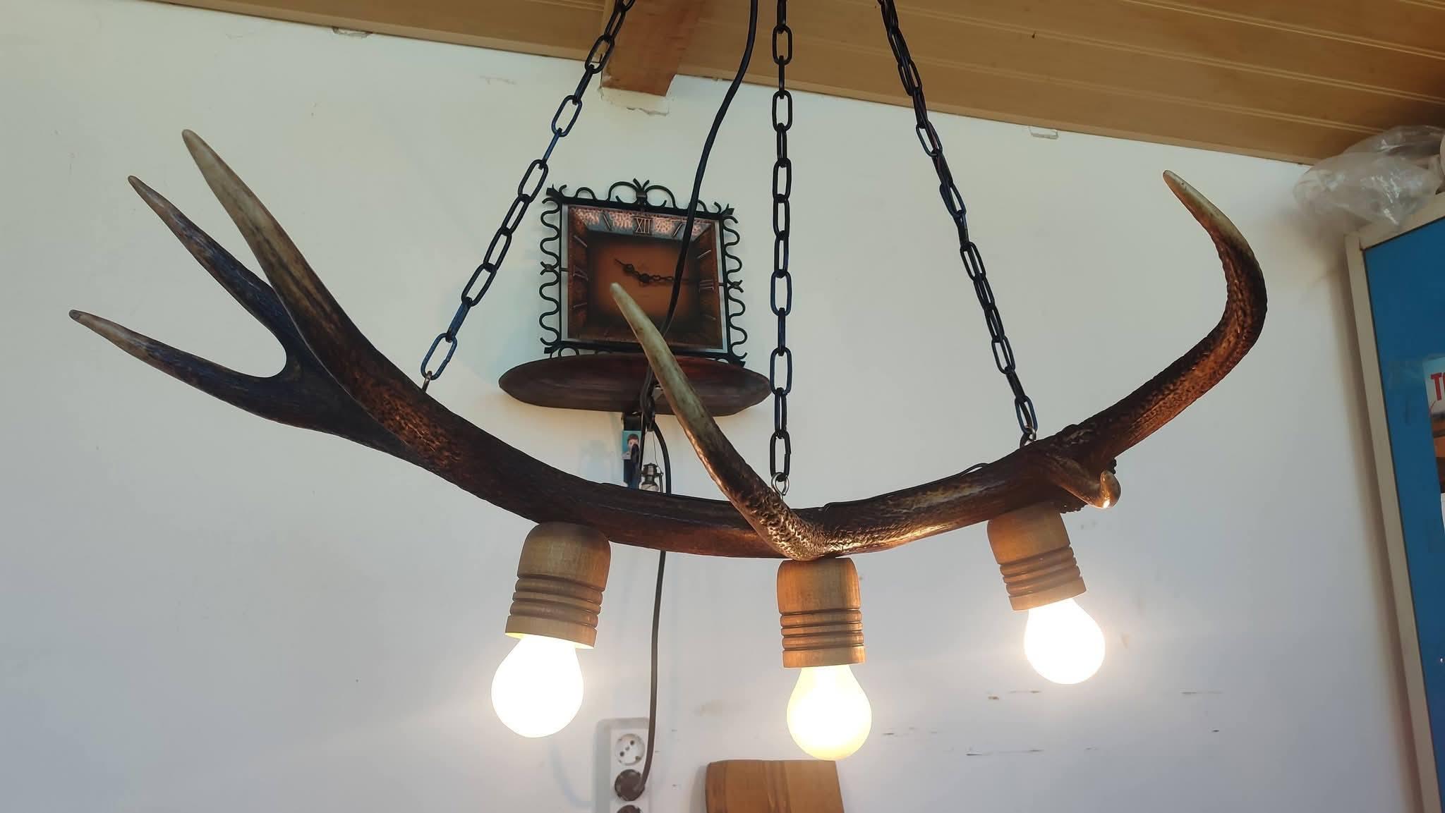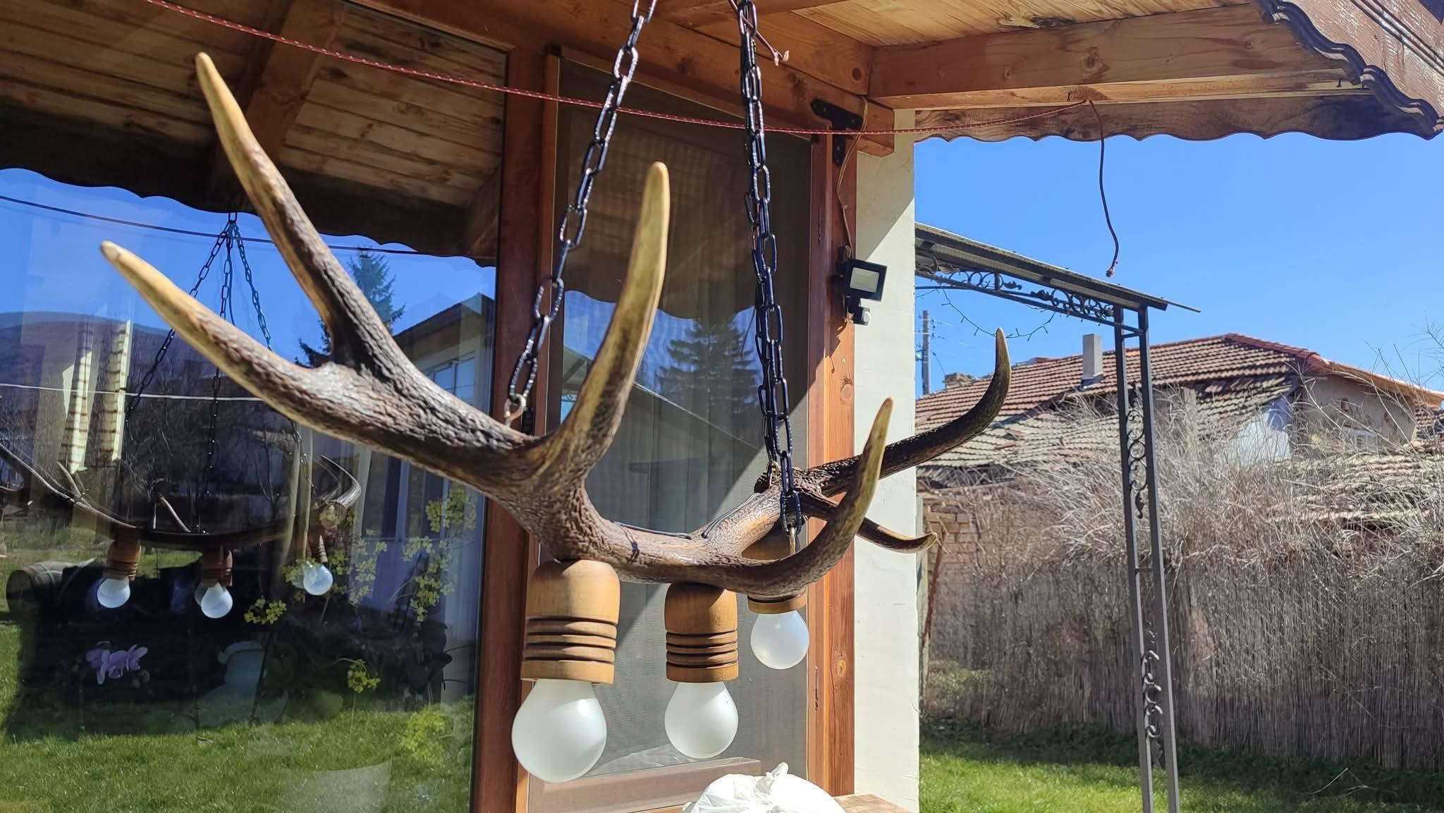 Ръчно изработен полилей от рога на елен с ръчно изработени дървени чашки, Фасунгите са Е 27 стандартни, със синджири, дължина около 80 см