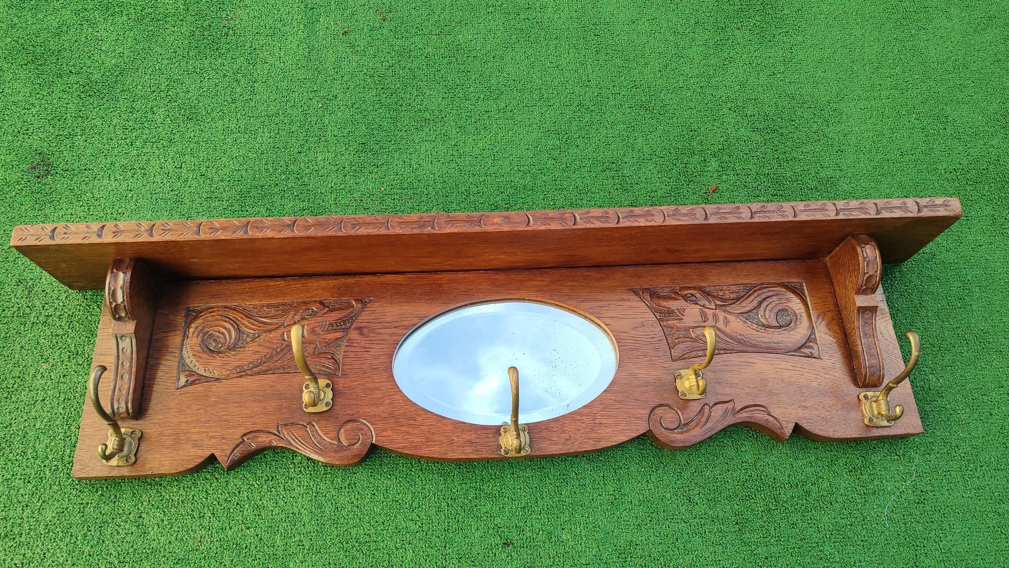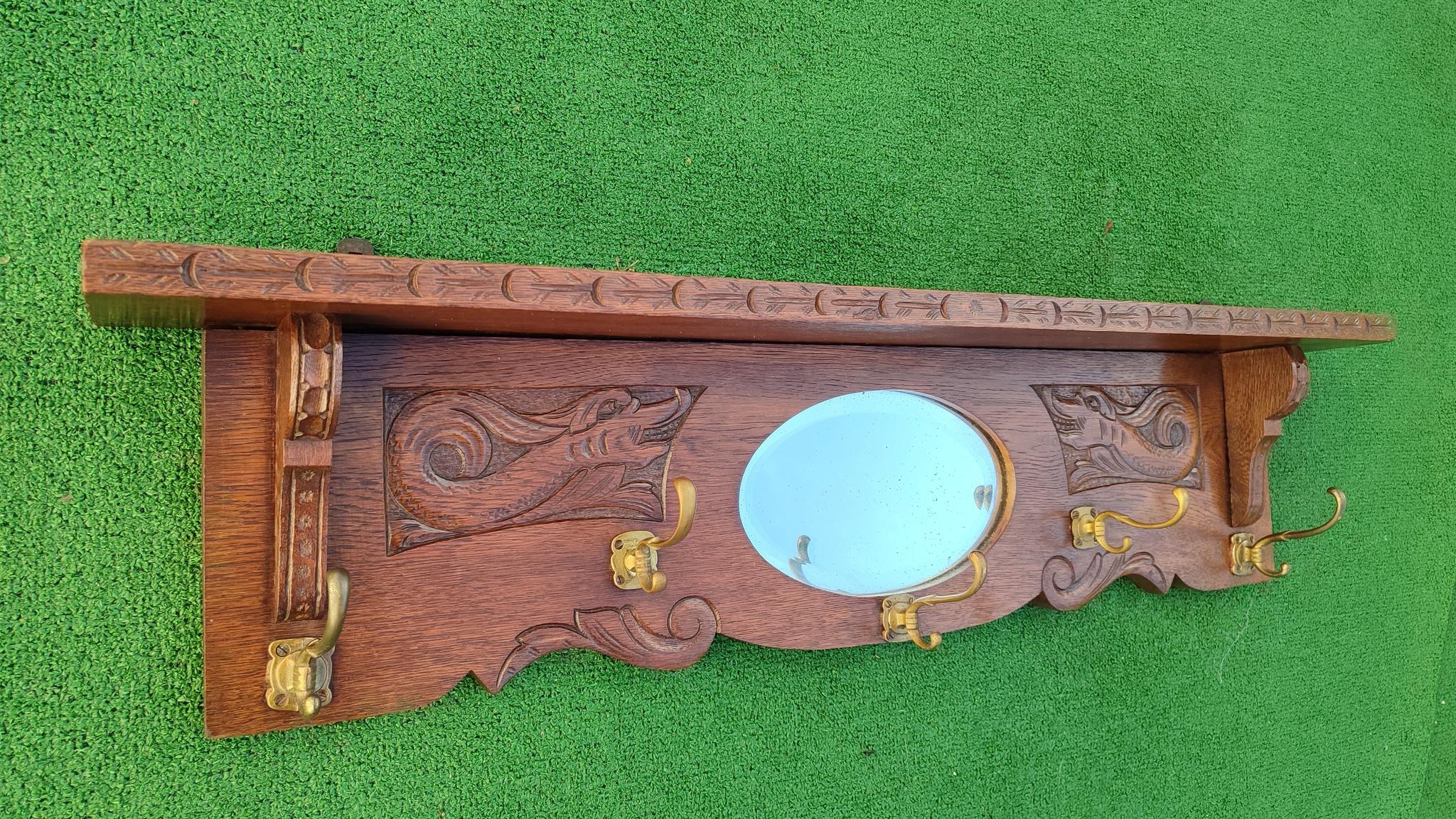 дължина 90-100 см, красив и стилен дизайн старинна дъбова закачалка с рафт отгоре, огледало и дърворезба